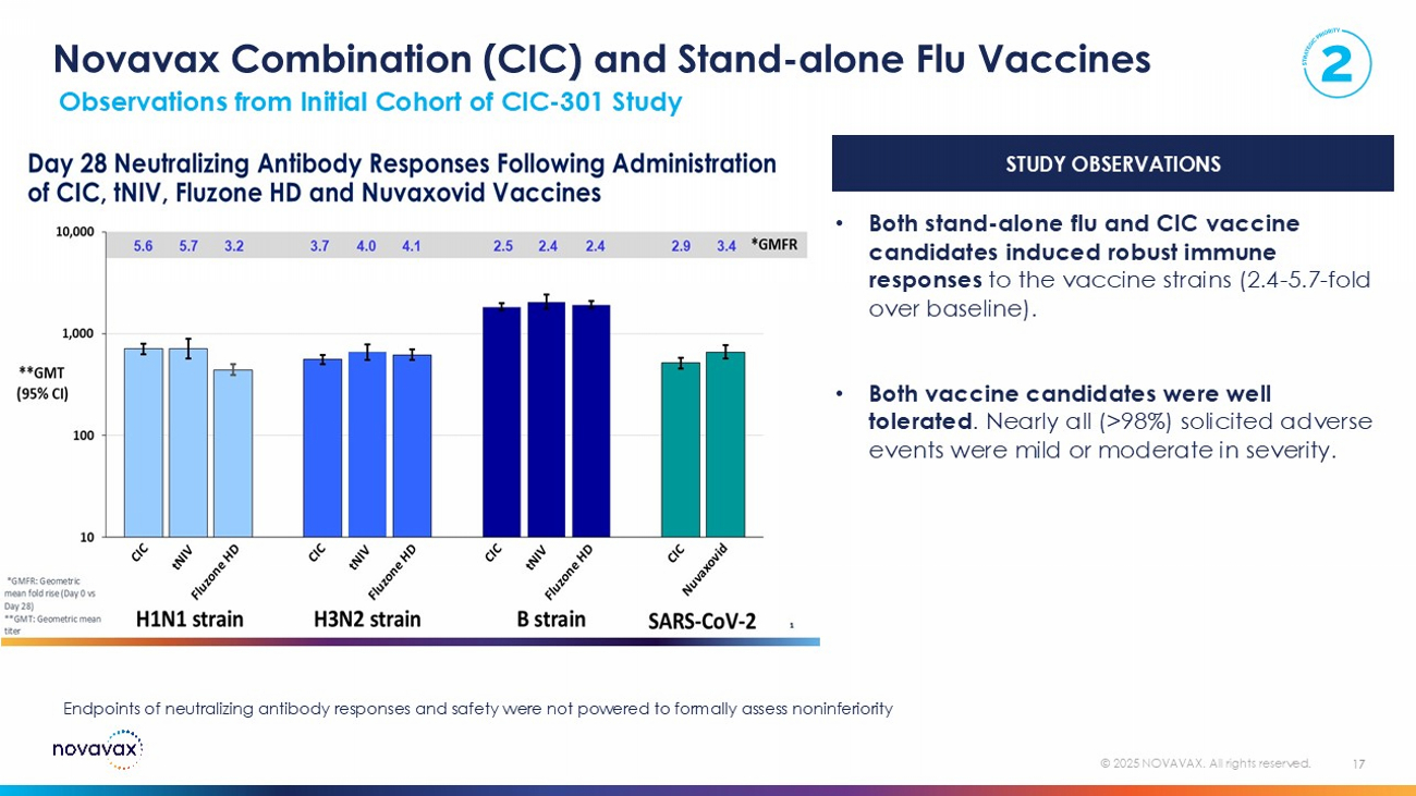 Novavax Combination (CIC) and Stand - alone Flu Vaccines 16 Fluzone HD CIC Nuvaxovid Novavax's Flu Vaccine ( tNIV ) Participants were randomized to one of four arms: Immunogenicity comparisons Immunogenicity comparisons Novavax intends to partner both vaccine candidates to advance further development © 2025 NOVAVAX. All rights reserved. Initial Cohort of a Phase 3 Trial Initiated in Dec 2024 OBJECTIVES • Assess safety and reactogenicity of COVID - 19 Influenza combination vaccine (CIC) and tNIV compared to Fluzone HD and Nuvaxovid • Assess immunogenicity of CIC and tNIV vaccines compared to Fluzone HD and Nuvaxovid • Cohort was designed to provide descriptive data DESIGN • ~2,000 adults aged ≥ 65 years enrolled • 1 dose of CIC, tNIV , Nuvaxovid or Fluzone HD rS • HA dose range: 60 μ g/strain/dose (CIC and tNIV ) • Spike ( rS )dose: 35 μ g (CIC) • Matrix - M dose: 75 μ g/dose (CIC and tNIV ) • Spike ( rS ) / Matrix dose: 5 μ g / 50 μ g (Nuvaxovid) Study data to inform a future registrational Phase 3 program