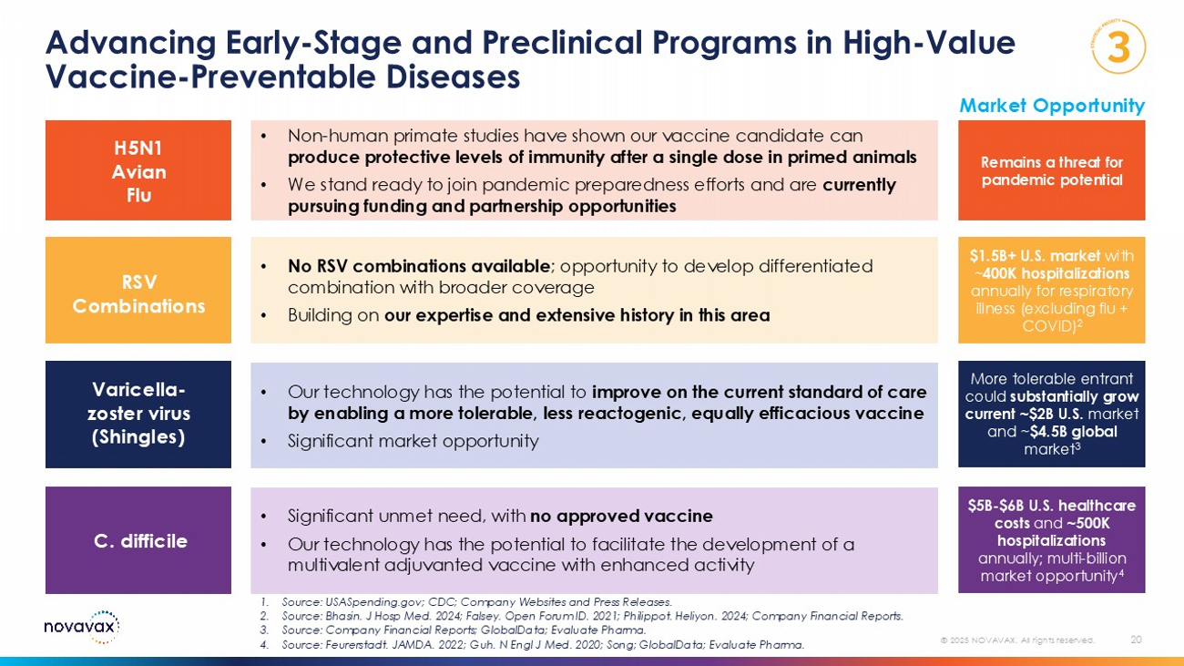 Partner Authorized Use Phase 3 Phase 2 Phase 1 Preclinical Candidate Therapeutic Area Novavax Novavax COVID - 19 Vaccine 1 Respiratory diseases COVID - 19 COVID - influenza combination (CIC) vaccine 2 Respiratory diseases COVID - 19 + seasonal influenza Influenza vaccine (older adults) Respiratory diseases Seasonal influenza RSV combinations (RSV, hMPV, other respiratory) Respiratory diseases Respiratory syncytial virus (RSV) Highly pathogenic H5N1 avian pandemic influenza vaccine Respiratory diseases H5N1 avian pandemic influenza Shingles vaccine Viral infection Varicella - zoster virus (shingles) C. diff vaccine Bacterial disease Clostridioides difficile (C. diff) colitis Matrix - M Matrix - M Matrix - M Matrix - M Matrix - M Matrix - M Matrix - M 1. Authorized in select geographies under trade names Novavax COVID - 19 Vaccine, Adjuvanted; Covovax ; and Nuvaxovid ® . 2. Initial cohort of a Phase 3 immunogenicity & safety clinical trial. Study data to inform a future Phase 3 program. In - House R&D Pipeline Diversification 19 © 2025 NOVAVAX. All rights reserved.