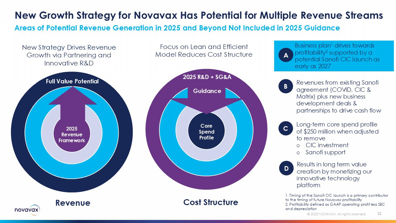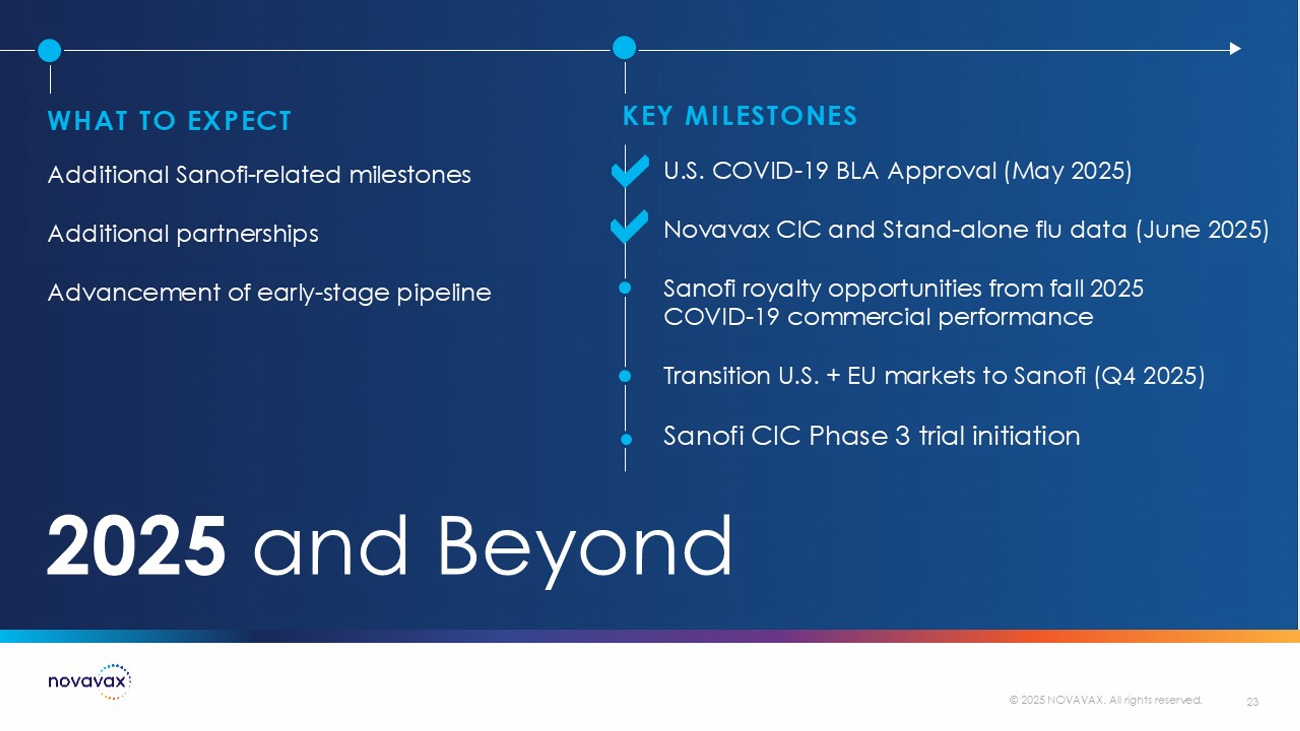 New Growth Strategy for Novavax Has Potential for Multiple Revenue Streams Areas of Potential Revenue Generation in 2025 and Beyond Not Included in 2025 Guidance 2025 Revenue Framework New Strategy Drives Revenue Growth via Partnering and Innovative R&D Core Spend Profile Focus on Lean and Efficient M odel Reduces C ost Structure 2025 R&D + SG&A Guidance Full Value Potential Revenue Cost Structure © 2025 NOVAVAX. All rights reserved. Long - term core spend profile of $250 million when adjusted to remove o CIC investment o Sanofi support Business plan 1 drives towards profitability 2 supported by a potential Sanofi CIC launch as early as 2027 A Revenues from existing Sanofi agreement (COVID, CIC & Matrix) plus new business development deals & partnerships to drive cash flow B Results in long term value creation by monetizing our innovative technology platform 1. Timing of the Sanofi CIC launch is a primary contributor to the timing of future Novavax profitability 2. Profitability defined as GAAP operating profit less SBC and depreciation C D 22