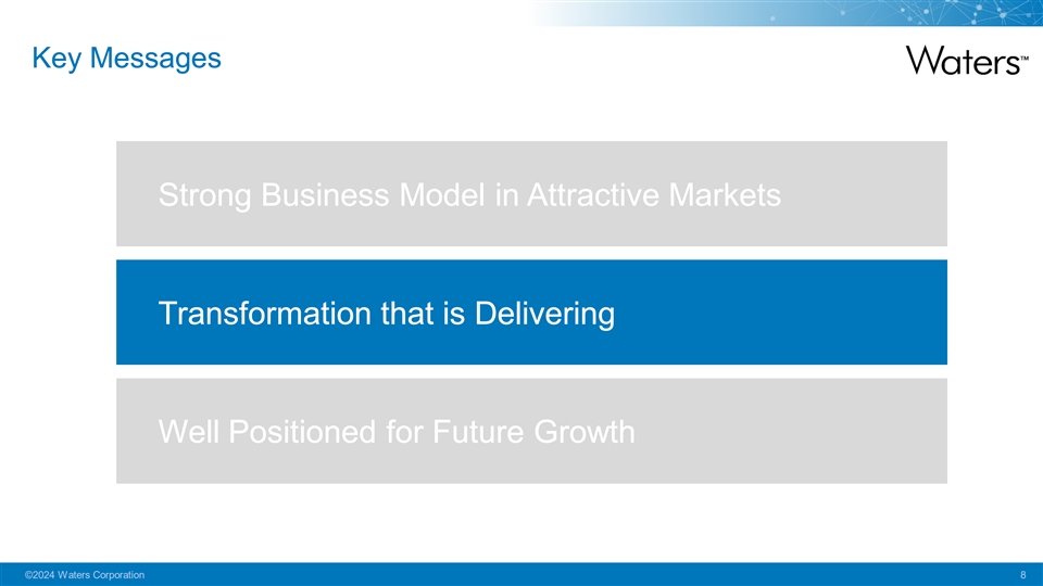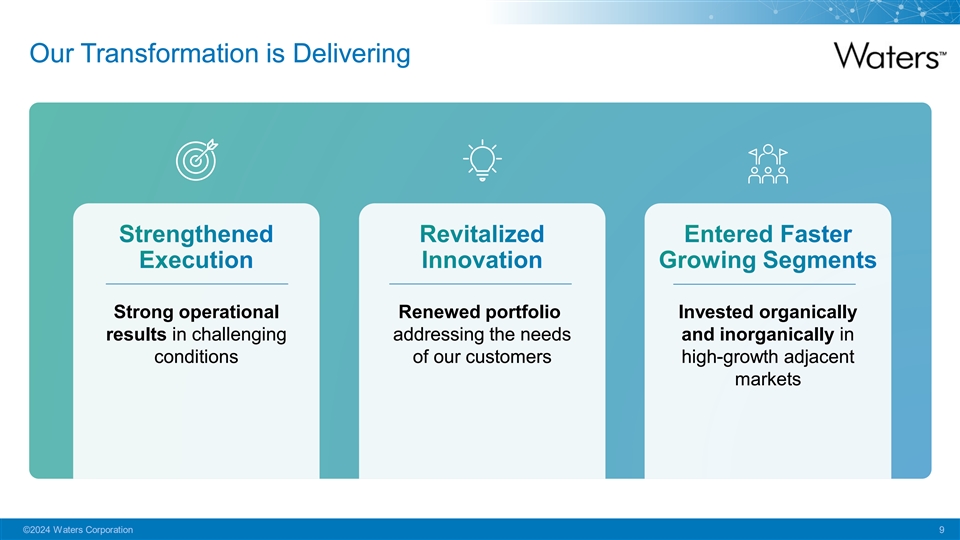Key Messages Strong Business Model in Attractive Markets Transformation that is Delivering Well Positioned for Future Growth ©2024 Waters Corporation 8