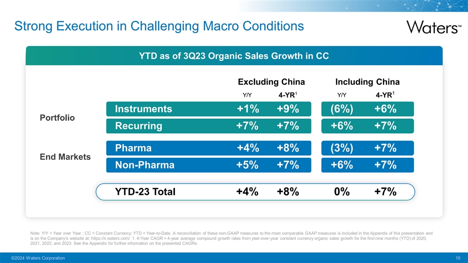 Our Transformation is Delivering Strong operational Renewed portfolio Invested organically results in challenging addressing the needs and inorganically in conditions of our customers high-growth adjacent markets ©2024 Waters Corporation 9