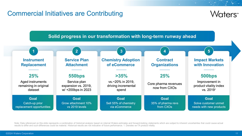 Strong Execution in Challenging Macro Conditions YTD as of 3Q23 Organic Sales Growth in CC Excluding China Including China 1 1 Y/Y 4-YR Y/Y 4-YR Instruments +1% +9% (6%) +6% Portfolio Recurring +7% +7% +6% +7% Pharma +4% +8% (3%) +7% End Markets Non-Pharma +5% +7% +6% +7% YTD-23 Total +4% +8% 0% +7% Note: Y/Y = Year over Year ; CC = Constant Currency; YTD = Year-to-Date. A reconciliation of these non-GAAP measures to the most comparable GAAP measures is included in the Appendix of this presentation and is on the Company’s website at: https://ir.waters.com/ 1. 4-Year CAGR = 4-year average compound growth rates from year-over-year constant currency organic sales growth for the first nine months (YTD) of 2020, 2021, 2022, and 2023. See the Appendix for further information on the presented CAGRs. ©2024 Waters Corporation 10