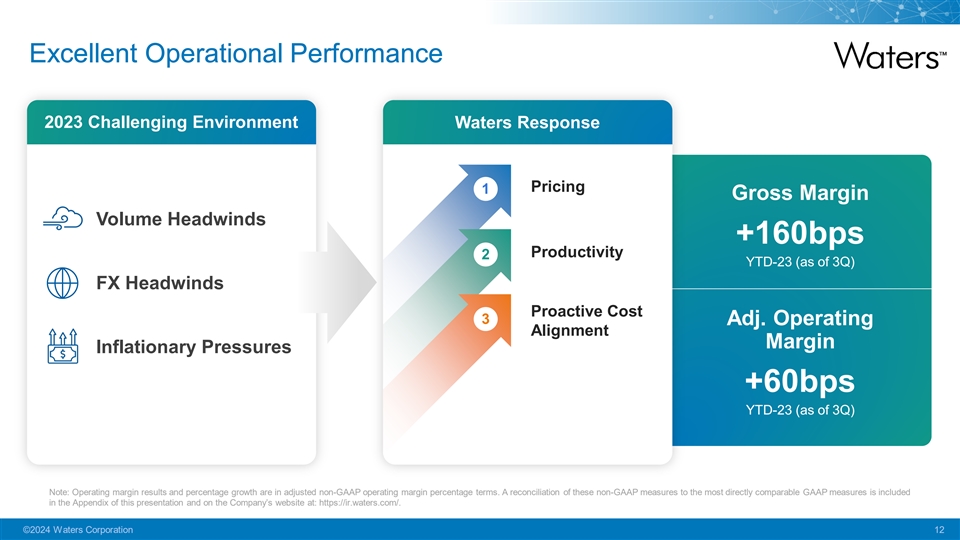 Commercial Initiatives are Contributing Solid progress in our transformation with long-term runway ahead 1 2 3 4 5 Instrument Service Plan Chemistry Adoption Contract Impact Markets Replacement Attachment of eCommerce Organizations with Innovation 25% 550bps >35% 25% 500bps Aged instruments Service plan vs.~20% in 2019, Improvement in Core pharma revenues remaining in original expansion vs. 2019, driving incremental product vitality index now from CXOs 1 dataset w/ +200bps in 2023 spend vs. 2019 Goal Goal Goal Goal Goal Catch-up prior Grow attachment 10% Sell 55% of chemistry 35% of pharma revs Solve customer unmet replacement opportunities vs 2019 levels via eCommerce from CXOs needs with new products Note: Data referenced on this slide represents a combination of historical analysis based on internal Waters estimates and forward-looking statements which are subject to inherent uncertainties that could cause actual results to differ and such differences could be material. Historical results are not indicative of future performance. 1. Denotes ex-TA product vitality ©2024 Waters Corporation 11