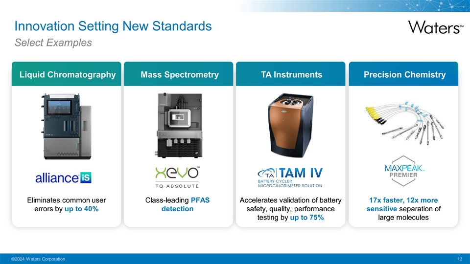 Excellent Operational Performance 2023 Challenging Environment Waters Response Pricing 1 Gross Margin Volume Headwinds +160bps Productivity 2 YTD-23 (as of 3Q) FX Headwinds Proactive Cost 3 Adj. Operating Alignment Margin Inflationary Pressures +60bps YTD-23 (as of 3Q) Note: Operating margin results and percentage growth are in adjusted non-GAAP operating margin percentage terms. A reconciliation of these non-GAAP measures to the most directly comparable GAAP measures is included in the Appendix of this presentation and on the Company’s website at: https://ir.waters.com/. $7B Total Accessible Market ©2024 Waters Corporation 12