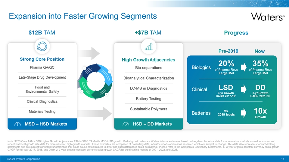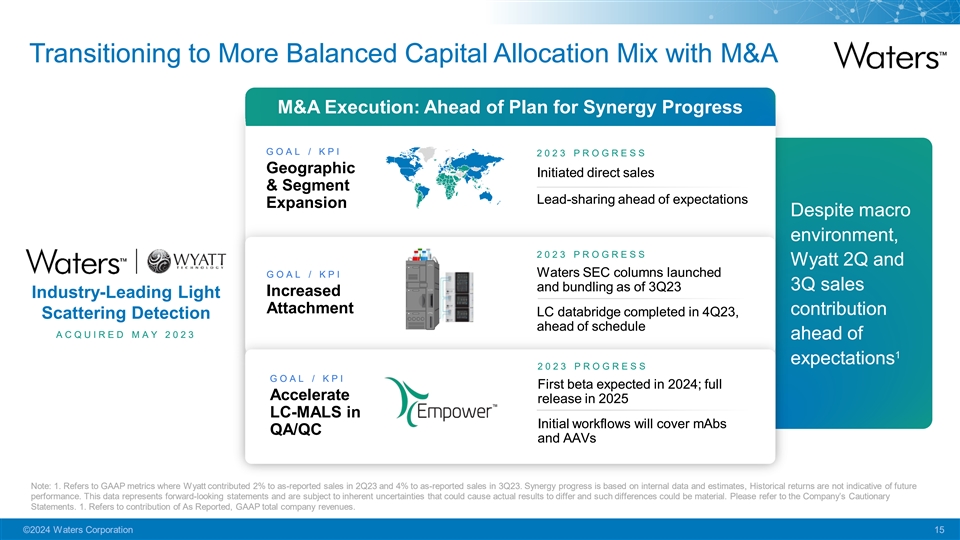 Expansion into Faster Growing Segments $12B TAM 20% 35% Biologics of Pharma Revs of Pharma Revs Large Mol Large Mol LSD DD Clinical 3-yr Growth 3-yr Growth 1 2 CAGR 2017-19 CAGR 2021-23 Vs. 10x Batteries 2019 levels Growth Note: $12B Core TAM + $7B Higher Growth Adjacencies TAM = $19B TAM with MSD-HSD growth. Market growth rates are Waters internal estimates based on long-term historical data for more mature markets as well as current and recent historical growth rate data for more nascent, high-growth markets. These estimates are comprised of consulting data, industry reports and market research which are subject to change. This data also represents forward-looking statements and are subject to inherent uncertainties that could cause actual results to differ and such differences could be material. Please refer to the Company’s Cautionary Statements. 1. 3-year organic constant currency sales growth CAGR for full year 2017, 2018, and 2019. 2. 3-year organic constant currency sales growth CAGR for the first nine months of 2021, 2022, and 2023. ©2024 Waters Corporation 14