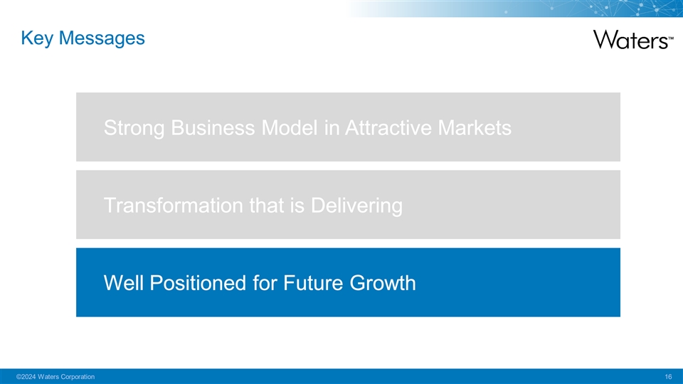 Key Messages Strong Business Model in Attractive Markets Transformation that is Delivering Well Positioned for Future Growth ©2024 Waters Corporation 16