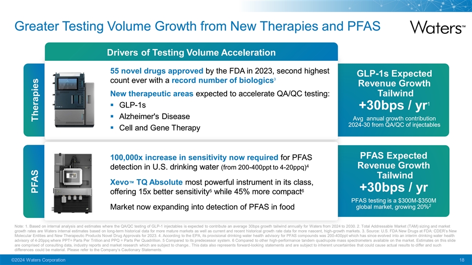 Aligned with Secular Tailwinds that are Stronger than Ever Waters % Revenue Growth (Y/Y Constant Currency 2008-22) Incremental Growth Vectors 2 vs. Historical Trends 6% 20% 1 Faster Volume Growth Average 1 5% 10% 2008-2022 § Faster Prescription growth 1 Avg § Regulations (PFAS) 0% New Applications 2 -10% § Large molecule and novel modalities require more extensive analysis 10% Above Historic Pricing 3 § Expected to drive +100bps 7% future long-term growth 1 Avg 0% Historical Future Long-Term Long-Term Growth Growth Potential Note: 1. Average Annual Growth Rates of year-over-year, constant currency sales growth from 2008 to 2022. Growth rates here reflect our internal analysis of Waters historical, annual non-GAAP sales data which is publicly available, including the relevant GAAP to Non-GAAP reconciliations for each year. 2. Estimates on this page are comprised of internal analysis, consulting data, industry reports and market research which are subject to change. This data also represents forward-looking statements and are subject to inherent uncertainties that could cause actual results to differ and such differences could be material. Please refer to the Company’s Cautionary Statements. ©2024 Waters Corporation 17 Recurring Instruments 08 09 10 11 12 13 14 15 16 17 18 19 20 21 22