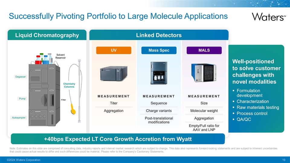 Greater Testing Volume Growth from New Therapies and PFAS Drivers of Testing Volume Acceleration 55 novel drugs approved by the FDA in 2023, second highest GLP-1s Expected 3 count ever with a record number of biologics Revenue Growth New therapeutic areas expected to accelerate QA/QC testing: Tailwind 1 § GLP-1s +30bps / yr § Alzheimer's Disease Avg annual growth contribution 2024-30 from QA/QC of injectables § Cell and Gene Therapy PFAS Expected 100,000x increase in sensitivity now required for PFAS 4 Revenue Growth detection in U.S. drinking water (from 200-400ppt to 4-20ppq) Tailwind Xevo™ TQ Absolute most powerful instrument in its class, +30bps / yr 5 6 offering 15x better sensitivity while 45% more compact PFAS testing is a $300M-$350M 2 global market, growing 20% Market now expanding into detection of PFAS in food Note: 1. Based on internal analysis and estimates where the QA/QC testing of GLP-1 injectables is expected to contribute an average 30bps growth tailwind annually for Waters from 2024 to 2030. 2. Total Addressable Market (TAM) sizing and market growth rates are Waters internal estimates based on long-term historical data for more mature markets as well as current and recent historical growth rate data for more nascent, high-growth markets. 3. Source: U.S. FDA New Drugs at FDA: CDER’s New Molecular Entities and New Therapeutic Products Novel Drug Approvals for 2023. 4. According to the EPA, its provisional drinking water health advisory for PFAS compounds was 200-400ppt which has since evolved into an interim drinking water health advisory of 4-20ppq where PPT= Parts Per Trillion and PPQ = Parts Per Quadrillion. 5 Compared to its predecessor system. 6 Compared to other high-performance tandem quadrupole mass spectrometers available on the market. Estimates on this slide are comprised of consulting data, industry reports and market research which are subject to change.. This data also represents forward-looking statements and are subject to inherent uncertainties that could cause actual results to differ and such differences could be material. Please refer to the Company’s Cautionary Statements. ©2024 Waters Corporation 18 PFAS Therapies