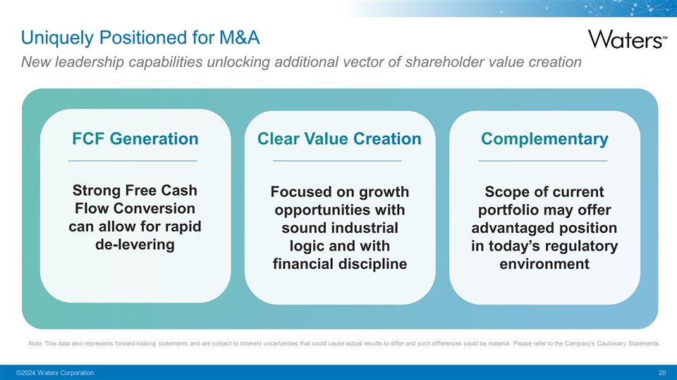 Successfully Pivoting Portfolio to Large Molecule Applications Liquid Chromatography Linked Detectors UV Mass Spec MALS Solvent Reservoir Well-positioned to solve customer challenges with Degasser novel modalities Chemistry Columns § Formulation development M EA SU R EM EN T M EA SU R EM EN T M EA SU R EM EN T Pump Filter § Characterization Titer Sequence Size § Raw materials testing Aggregation Charge variants Molecular weight § Process control Autosampler Post-translational Aggregation § QA/QC modifications Empty/Full ratio for AAV and LNP +40bps Expected LT Core Growth Accretion from Wyatt Note: Estimates on this slide are comprised of consulting data, industry reports and internal market research which are subject to change. This data also represents forward-looking statements and are subject to inherent uncertainties that could cause actual results to differ and such differences could be material. Please refer to the Company’s Cautionary Statements. ©2024 Waters Corporation 19