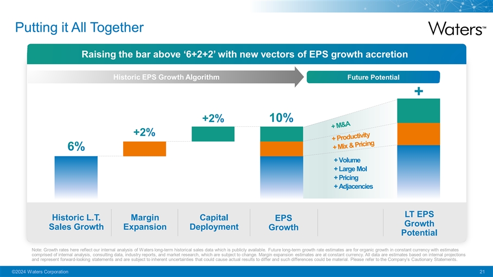 Uniquely Positioned for M&A New leadership capabilities unlocking additional vector of shareholder value creation Strong Free Cash Focused on growth Scope of current Flow Conversion opportunities with portfolio may offer can allow for rapid sound industrial advantaged position de-levering logic and with in today’s regulatory financial discipline environment Note: This data also represents forward-looking statements and are subject to inherent uncertainties that could cause actual results to differ and such differences could be material. Please refer to the Company’s Cautionary Statements. ©2024 Waters Corporation 20