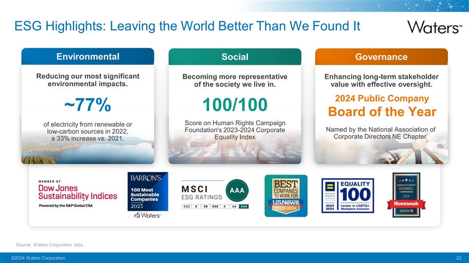 Putting it All Together Raising the bar above ‘6+2+2’ with new vectors of EPS growth accretion Historic EPS Growth Algorithm F Fut utur ure e P Po ot te ent ntiia all + Volume + Large Mol + Pricing + Adjacencies LT EPS Historic L.T. Margin Capital EPS Growth Sales Growth Expansion Deployment Growth Potential Note: Growth rates here reflect our internal analysis of Waters long-term historical sales data which is publicly available. Future long-term growth rate estimates are for organic growth in constant currency with estimates comprised of internal analysis, consulting data, industry reports, and market research, which are subject to change. Margin expansion estimates are at constant currency. All data are estimates based on internal projections and represent forward-looking statements and are subject to inherent uncertainties that could cause actual results to differ and such differences could be material. Please refer to the Company’s Cautionary Statements. ©2024 Waters Corporation 21