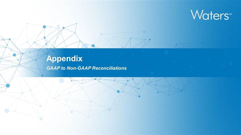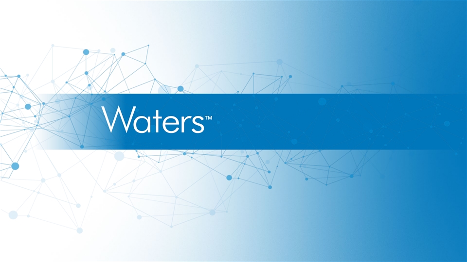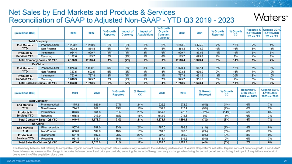 Net Sales by End Markets and Products & Services Reconciliation of GAAP to Adjusted Non-GAAP - YTD Q3 2019 - 2023 % Growth Reported % Organic CC % % Growth Impact of Impact of Organic % Growth % Growth (in millions USD) 2023 2022 2022 2021 2-YR CAGR 2-YR CAGR Reported Currency Acquisitions Constant Reported CC ‘23 vs. ‘21 ‘23 vs. ‘21 Currency Total Company Pharmaceutical 1,233.2 1,258.9 (2%) (2%) 3% (3%) 1,258.9 1,175.2 7% 12% 2% 4% End Markets YTD Non-Pharma 903.8 854.5 6% (1%) 1% 6% 854.5 774.2 10% 16% 8% 11% Instruments 964.4 999.7 (4%) (1%) 3% (6%) 999.7 873.6 14% 19% 5% 6% Products & Services YTD Recurring 1,172.6 1,113.7 5% (2%) 1% 6% 1,113.7 1,075.8 4% 9% 4% 8% Total Company Sales - Q3 YTD 2,136.9 2,113.4 1% (2%) 2% 0% 2,113.4 1,949.4 8% 14% 5% 7% Ex-China Pharmaceutical 1,076.3 1,020.1 6% (2%) 3% 4% 1,020.1 967.4 5% 12% 5% 8% End Markets YTD Non-Pharma 727.5 693.5 5% (2%) 1% 5% 693.5 636.0 9% 15% 7% 10% Instruments 763.6 737.9 3% (1%) 4% 1% 737.9 651.9 13% 20% 8% 10% Products & Services YTD Recurring 1,040.3 975.7 7% (2%) 1% 7% 975.7 951.5 3% 9% 5% 8% 1,803.8 1,713.6 5% (2%) 3% 4% 1,713.6 1,603.4 7% 13% 6% 9% Total Sales Ex-China – Q3 YTD Reported % Organic CC % % Growth % Growth % Growth % Growth (in millions USD) 2021 2020 2020 2019 4-YR CAGR 4-YR CAGR Reported CC Reported CC 2023 vs. 2019 2023 vs. 2019 Total Company Pharmaceutical 1,175.2 926.6 27% 24% 926.6 972.9 (5%) (4%) 6% 7% End Markets YTD Non-Pharma 774.2 652.1 19% 16% 652.1 717.4 (9%) (9%) 6% 7% Instruments 873.6 664.8 31% 29% 664.8 778.5 (15%) (14%) 5% 6% Products & Services YTD Recurring 1,075.8 913.9 18% 15% 913.9 911.8 0% 1% 6% 7% Total Company Sales - Q3 YTD 1,949.4 1,578.7 23% 21% 1,578.7 1,690.3 (7%) (6%) 6% 7% Ex-China Pharmaceutical 967.4 787.0 23% 21% 787.0 798.9 (1%) (1%) 8% 8% End Markets YTD Non-Pharma 636.0 539.0 18% 15% 539.0 576.8 (7%) (6%) 6% 7% Instruments 651.9 507.6 28% 26% 507.6 556.2 (9%) (9%) 8% 9% Products & Services YTD Recurring 951.5 818.4 16% 14% 818.4 819.5 (0%) 0% 6% 7% Total Sales Ex-China – Q3 YTD 1,603.4 1,326.0 21% 19% 1,326.0 1,375.8 (4%) (3%) 7% 8% The Company believes that referring to comparable organic constant currency growth rates is a useful way to evaluate the underlying performance of Waters Corporation's net sales. Organic constant currency growth, a non-GAAP financial measure, measures the change in net sales between current and prior year periods, excluding the impact of foreign currency exchange rates during the current period and excluding the impact of acquisitions made within twelve months of the acquisition close date. ©2024 Waters Corporation 26