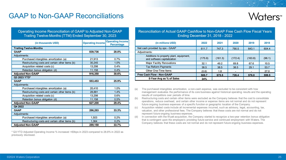 GAAP to Non-GAAP Reconciliations Operating Income Reconciliation of GAAP to Adjusted Non-GAAP Reconciliation of Actual GAAP Cashflow to Non-GAAP Free Cash Flow Fiscal Years Trailing Twelve-Months (TTM) Ended September 30, 2023 Ending December 31, 2018 - 2022 Operating Income (in thousands USD) Operating Income (in millions USD) 2022 2021 2020 2019 2018 Percentage Trailing Twelve-Months Net cash provided by ops - GAAP 611.7 747.3 790.5 643.1 604.4 GAAP 839,736 28.0% Adjustments: Adjustments: Additions to property plant, equipment, (175.9) (161.3) (172.4) (163.8) (96.1) Purchased intangibles amortization (a) 21,913 0.7% and software capitalization Restructuring costs and certain other items (b) 30,245 1.0% Major Facility Renovations 32.1 49.2 69.8 67.6 10.5 Acquisition related costs (c) 13,298 0.4% Tax Reform Payments 38.5 38.5 38.5 29.1 53.7 Retention bonus obligation (d) 11,158 0.4% Other One-Time Items (0.6) 1.8 - - 27.0 Adjusted Non-GAAP 916,350 30.6% Free Cash Flow - Non-GAAP 505.7 675.5 726.4 576.0 599.5 Q3 2023 YTD* 5-Year Avg as % of Sales 24% GAAP 553,453 25.9% Adjustments: Purchased intangibles amortization (a) 20,410 1.0% (a) The purchased intangibles amortization, a non-cash expense, was excluded to be consistent with how Restructuring costs and certain other items (b) 28,881 1.4% management evaluates the performance of its core business against historical operating results and the operating results of competitors over periods of time. Acquisition related costs (c) 13,298 0.6% (b) Restructuring costs and certain other items were excluded as the Company believes that the cost to consolidate Retention bonus obligation (d) 11,158 0.5% operations, reduce overhead, and certain other income or expense items are not normal and do not represent Adjusted Non-GAAP 627,200 29.4% future ongoing business expenses of a specific function or geographic location of the Company. Q4 2022 (c) Acquisition related costs include all incremental expenses incurred, such as advisory, legal, accounting, tax, GAAP 286,283 33.3% valuation, and other professional fees. The Company believes that these costs are not normal and do not represent future ongoing business expenses. Adjustments: (d) In connection with the Wyatt acquisition, the Company started to recognize a two-year retention bonus obligation Purchased intangibles amortization (a) 1,503 0.2% that is contingent upon the employee’s providing future service and continued employment with Waters. The Restructuring costs and certain other items (b) 1,364 0.2% Company believes that these costs are not normal and do not represent future ongoing business expenses. Adjusted Non-GAAP 289,150 33.7% * Q3 YTD Adjusted Operating Income % increased +60bps in 2023 compared to 28.8% in 2022 as previously disclosed. ©2024 Waters Corporation 25