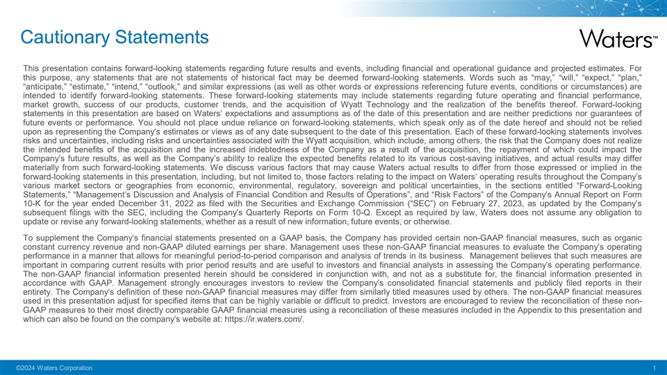 Cautionary Statements This presentation contains forward-looking statements regarding future results and events, including financial and operational guidance and projected estimates. For this purpose, any statements that are not statements of historical fact may be deemed forward-looking statements. Words such as “may,” “will,” “expect,” “plan,” “anticipate,” “estimate,” “intend,” “outlook,” and similar expressions (as well as other words or expressions referencing future events, conditions or circumstances) are intended to identify forward-looking statements. These forward-looking statements may include statements regarding future operating and financial performance, market growth, success of our products, customer trends, and the acquisition of Wyatt Technology and the realization of the benefits thereof. Forward-looking statements in this presentation are based on Waters’ expectations and assumptions as of the date of this presentation and are neither predictions nor guarantees of future events or performance. You should not place undue reliance on forward-looking statements, which speak only as of the date hereof and should not be relied upon as representing the Company’s estimates or views as of any date subsequent to the date of this presentation. Each of these forward-looking statements involves risks and uncertainties, including risks and uncertainties associated with the Wyatt acquisition, which include, among others, the risk that the Company does not realize the intended benefits of the acquisition and the increased indebtedness of the Company as a result of the acquisition, the repayment of which could impact the Company’s future results, as well as the Company’s ability to realize the expected benefits related to its various cost-saving initiatives, and actual results may differ materially from such forward-looking statements. We discuss various factors that may cause Waters actual results to differ from those expressed or implied in the forward-looking statements in this presentation, including, but not limited to, those factors relating to the impact on Waters’ operating results throughout the Company’s various market sectors or geographies from economic, environmental, regulatory, sovereign and political uncertainties, in the sections entitled “Forward-Looking Statements,” “Management’s Discussion and Analysis of Financial Condition and Results of Operations”, and “Risk Factors” of the Company’s Annual Report on Form 10-K for the year ended December 31, 2022 as filed with the Securities and Exchange Commission (“SEC”) on February 27, 2023, as updated by the Company’s subsequent filings with the SEC, including the Company’s Quarterly Reports on Form 10-Q. Except as required by law, Waters does not assume any obligation to update or revise any forward-looking statements, whether as a result of new information, future events, or otherwise. To supplement the Company’s financial statements presented on a GAAP basis, the Company has provided certain non-GAAP financial measures, such as organic constant currency revenue and non-GAAP diluted earnings per share. Management uses these non-GAAP financial measures to evaluate the Company’s operating performance in a manner that allows for meaningful period-to-period comparison and analysis of trends in its business. Management believes that such measures are important in comparing current results with prior period results and are useful to investors and financial analysts in assessing the Company’s operating performance. The non-GAAP financial information presented herein should be considered in conjunction with, and not as a substitute for, the financial information presented in accordance with GAAP. Management strongly encourages investors to review the Company’s consolidated financial statements and publicly filed reports in their entirety. The Company’s definition of these non-GAAP financial measures may differ from similarly titled measures used by others. The non-GAAP financial measures used in this presentation adjust for specified items that can be highly variable or difficult to predict. Investors are encouraged to review the reconciliation of these non- GAAP measures to their most directly comparable GAAP financial measures using a reconciliation of these measures included in the Appendix to this presentation and which can also be found on the company’s website at: https://ir.waters.com/. ©2024 Waters Corporation 1