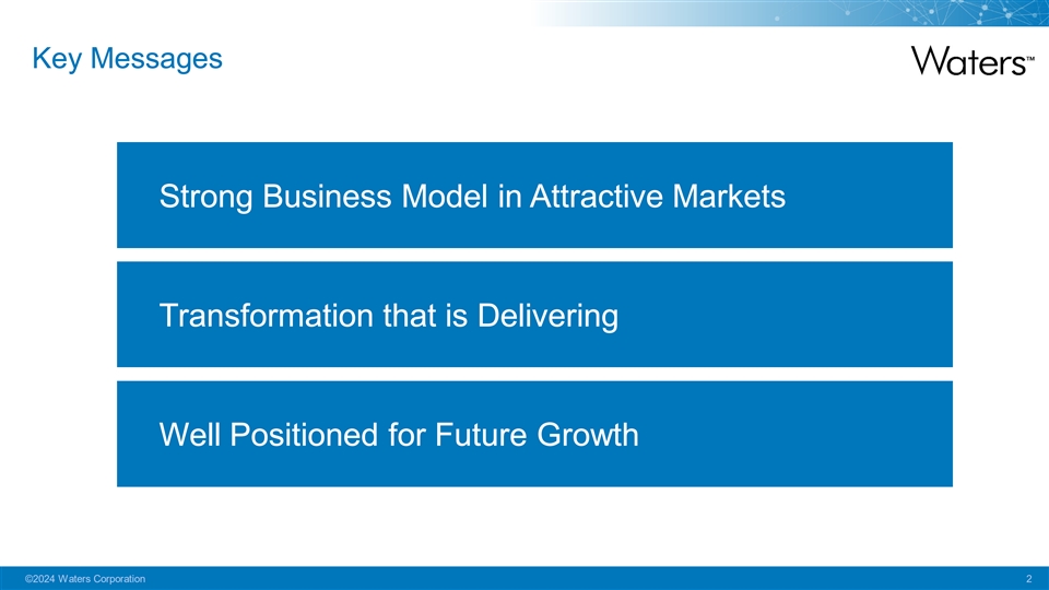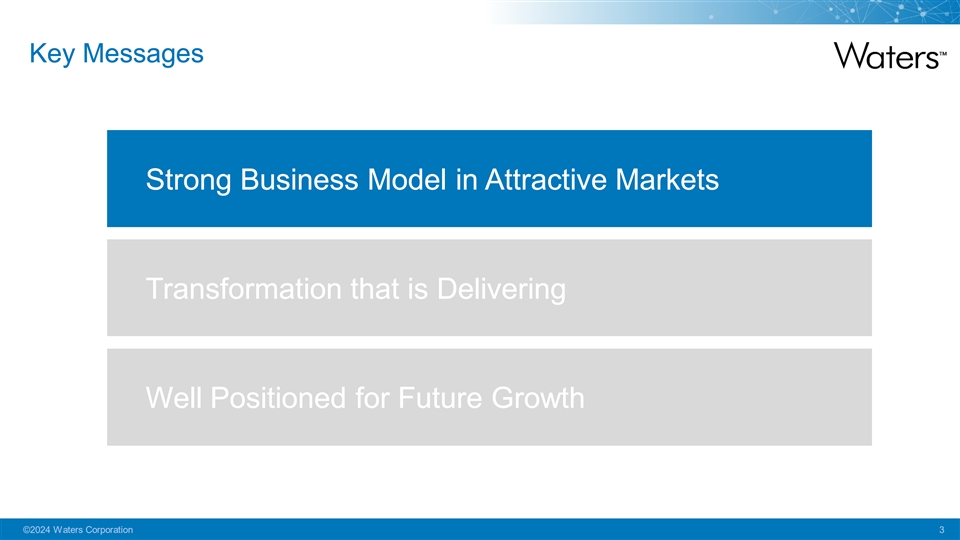 Key Messages Strong Business Model in Attractive Markets Transformation that is Delivering Well Positioned for Future Growth ©2024 Waters Corporation 2