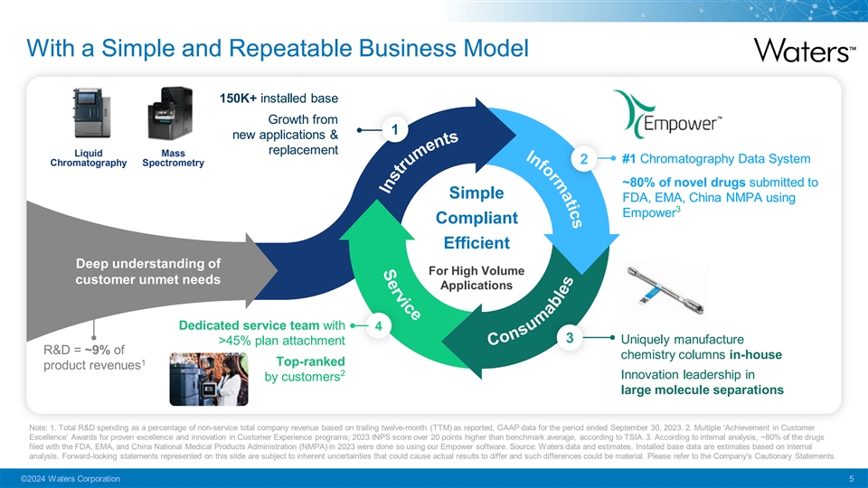 Waters Serves Regulated Markets with Large Unmet Needs Pharma Clinical Food & Environment Materials HSD HSD MSD MSD Safe renewable energy High-quality medicines Early disease detection Pure food and water Biologics, Novel Modalities Alzheimer's, Endocrine PFAS, Nitrosamines Batteries, Electric Vehicles $12B TAM* with 4-6% Long-Term Growth * TAM = Total Addressable Market, where $12B of a broader $80B TAM for Analytical Instruments is serviceable by Waters core (established) business. Growth rates here reflect our internal analysis of historical, long- term market trend data, which are subject to future changes. TAMs and growth rates are estimates based on internal projections and represent forward-looking statements and are subject to inherent uncertainties that could cause actual results to differ and such differences could be material. 1. Estimated total addressable market for analytical instruments of ~$80B; Source: Waters data and estimates, consulting data, industry reports, and market research. ©2024 Waters Corporation 4