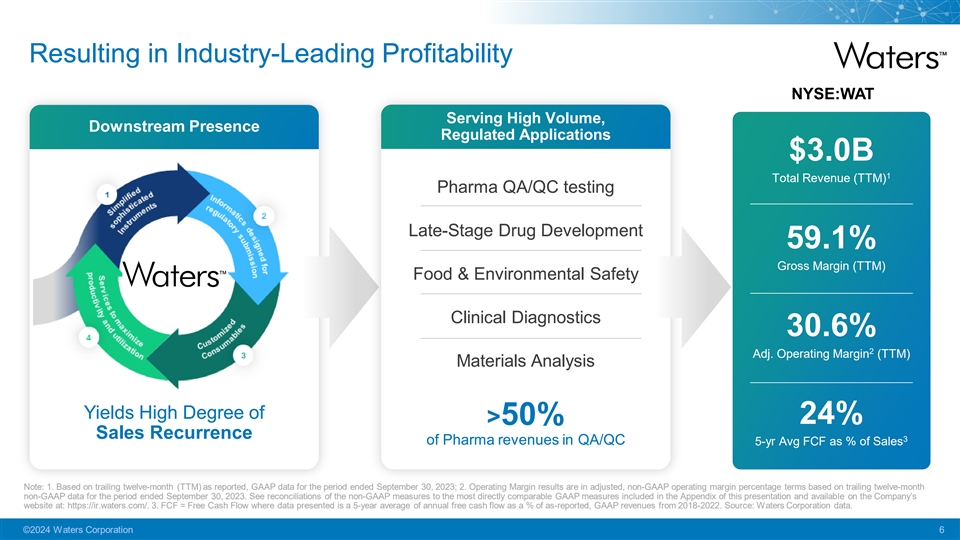 With a Simple and Repeatable Business Model 150K+ installed base Growth from 1 new applications & replacement Liquid Mass 2 #1 Chromatography Data System Chromatography Spectrometry ~80% of novel drugs submitted to Simple FDA, EMA, China NMPA using 3 Empower Compliant Efficient Deep understanding of For High Volume customer unmet needs Applications Dedicated service team with 4 3 Uniquely manufacture >45% plan attachment R&D = ~9% of chemistry columns in-house 1 Top-ranked product revenues 2 Innovation leadership in ​ by customers large molecule separations Note: 1. Total R&D spending as a percentage of non-service total company revenue based on trailing twelve-month (TTM) as reported, GAAP data for the period ended September 30, 2023. 2. Multiple ‘Achievement in Customer Excellence’ Awards for proven excellence and innovation in Customer Experience programs; 2023 tNPS score over 20 points higher than benchmark average, according to TSIA. 3. According to internal analysis, ~80% of the drugs filed with the FDA, EMA, and China National Medical Products Administration (NMPA) in 2023 were done so using our Empower software. Source: Waters data and estimates. Installed base data are estimates based on internal analysis. Forward-looking statements represented on this slide are subject to inherent uncertainties that could cause actual results to differ and such differences could be material. Please refer to the Company’s Cautionary Statements. ©2024 Waters Corporation 5