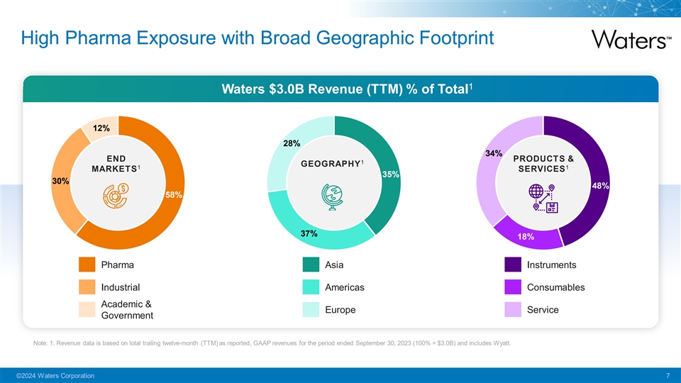 Resulting in Industry-Leading Profitability NYSE:WAT Serving High Volume, Downstream Presence Regulated Applications $3.0B 1 Total Revenue (TTM) Pharma QA/QC testing Late-Stage Drug Development 59.1% Gross Margin (TTM) Food & Environmental Safety Clinical Diagnostics 30.6% 2 Adj. Operating Margin (TTM) Materials Analysis Yields High Degree of 24% >50% Sales Recurrence 3 of Pharma revenues in QA/QC 5-yr Avg FCF as % of Sales Note: 1. Based on trailing twelve-month (TTM) as reported, GAAP data for the period ended September 30, 2023; 2. Operating Margin results are in adjusted, non-GAAP operating margin percentage terms based on trailing twelve-month non-GAAP data for the period ended September 30, 2023. See reconciliations of the non-GAAP measures to the most directly comparable GAAP measures included in the Appendix of this presentation and available on the Company’s $7B Total Accessible Market website at: https://ir.waters.com/. 3. FCF = Free Cash Flow where data presented is a 5-year average of annual free cash flow as a % of as-reported, GAAP revenues from 2018-2022. Source: Waters Corporation data. ©2024 Waters Corporation 6