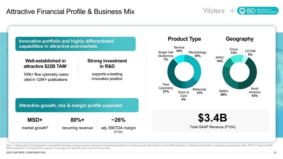 Biosciences & Diagnostic Solutions An Innovation Leader w/ Uniquely Differentiated Portfolio Biosciences Diagnostic Solutions ~$1.5B FY-24 GAAP REVENUE ~$1.8B FY-24 GAAP REVENUE New Breakthrough Products New Breakthrough Products $7B $15B 1 TAM; HSD% growth TAM; MSD+% growth FACSDiscover™ S8 Next-gen and A8 flow cytometers BD BACTEC™ Research Flow Microbiology Cytometry Diagnostics & Automation Clinical Flow High-throughput Rapidly growing antibody Cytometry Molecular Women’s and dyes portfolio Diagnostics Health MDx Single-Cell Multiomics Point of Care Medium-throughput Growing single cell MDx: Broad menu of Service & Service & multiomics menu targeted syndromic Informatics Informatics tests Note: 1. Excludes Cytology and COVID-only testing; Total Addressable Markets based on internal BD estimates. Category growths represent normalized expected future end-market growth rates based on internal BD estimates. FY represents BD Biosciences/Dx FY ending 9/30 for purposes of this page and where #s may not tie due to rounding. TAM = Total Addressable Market; HSD = High Single-Digits; MSD = Mid-Single-Digits. Segment Revenue stated aligns to Generally Accepted Accounting Principles (GAAP) in the U.S. 2025 WATERS CORPORATION 11