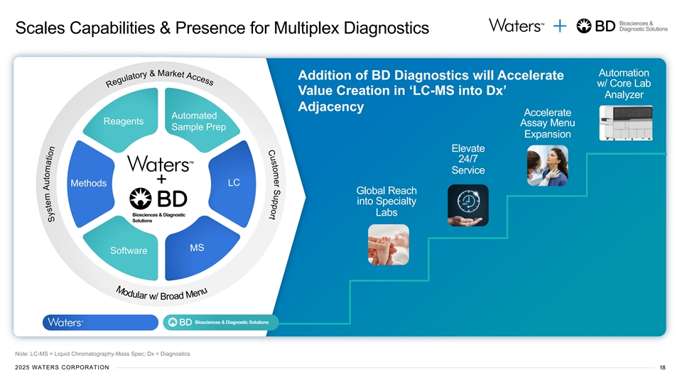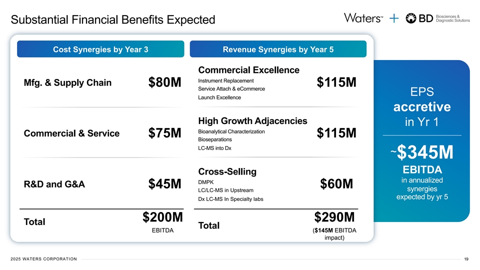 Biosciences & Diagnostic Solutions Scales Capabilities & Presence for Multiplex Diagnostics Automation Addition of BD Diagnostics will Accelerate w/ Core Lab Value Creation in ‘LC-MS into Dx’ Analyzer Adjacency Accelerate Automated Reagents Assay Menu Sample Prep Expansion Elevate 24/7 Service Methods + Global Reach into Specialty Biosciences & Diagnostic Labs Solutions Software Biosciences & Diagnostic Solutions Note: LC-MS = Liquid Chromatography-Mass Spec; Dx = Diagnostics 2025 WATERS CORPORATION 18 LC MS