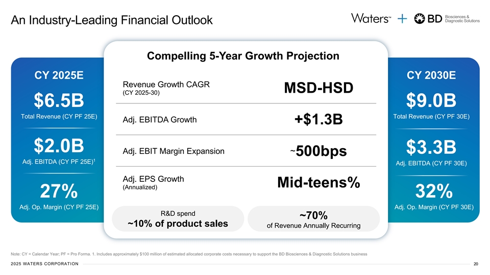 Biosciences & Diagnostic Solutions Substantial Financial Benefits Expected Cost Synergies by Year 3 Revenue Synergies by Year 5 Commercial Excellence Instrument Replacement Mfg. & Supply Chain $80M $115M Service Attach & eCommerce EPS Launch Excellence accretive High Growth Adjacencies in Yr 1 Bioanalytical Characterization Commercial & Service $75M $115M Bioseparations LC-MS into Dx ~ $345M EBITDA Cross-Selling in annualized DMPK R&D and G&A $45M $60M synergies LC/LC-MS in Upstream expected by yr 5 Dx LC-MS In Specialty labs $200M $290M Total Total EBITDA ($145M EBITDA impact) 2025 WATERS CORPORATION 19