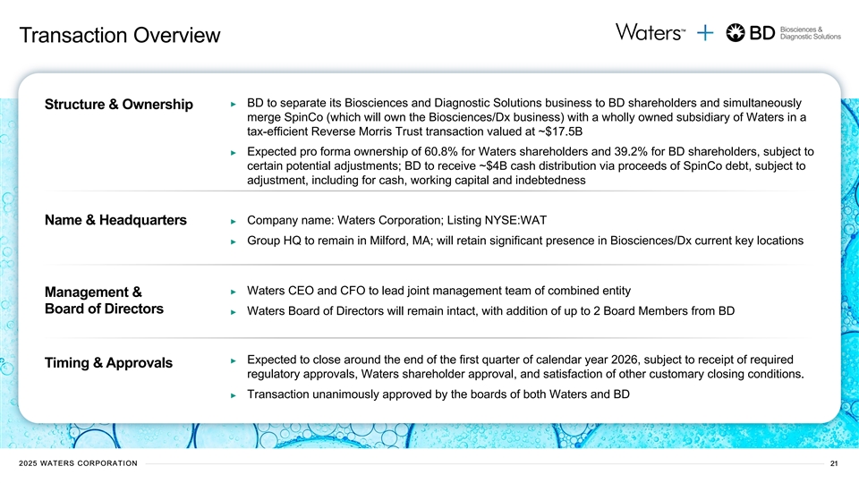 Biosciences & Diagnostic Solutions An Industry-Leading Financial Outlook Compelling 5-Year Growth Projection CY 2025E CY 2030E Revenue Growth CAGR MSD-HSD (CY 2025-30) $6.5B $9.0B Total Revenue (CY PF 25E) Total Revenue (CY PF 30E) Adj. EBITDA Growth +$1.3B $2.0B Adj. EBIT Margin Expansion ~ $3.3B 500bps 1 Adj. EBITDA (CY PF 25E) Adj. EBITDA (CY PF 30E) Adj. EPS Growth Mid-teens% (Annualized) 27% 32% Adj. Op. Margin (CY PF 25E) Adj. Op. Margin (CY PF 30E) R&D spend ~70% ~10% of product sales of Revenue Annually Recurring Note: CY = Calendar Year; PF = Pro Forma. 1. Includes approximately $100 million of estimated allocated corporate costs necessary to support the BD Biosciences & Diagnostic Solutions business 2025 WATERS CORPORATION 20