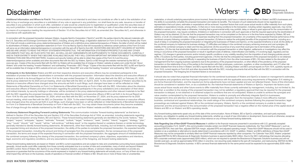 Biosciences & Diagnostic Solutions Disclaimer Additional Information and Where to Find It: This communication is not intended to and does not constitute an offer to sell or the solicitation of an materialize, or should underlying assumptions prove incorrect, these developments could have a material adverse effect on Waters’ and BD’s businesses and the ability to successfully complete the proposed transaction and realize its benefits. The inclusion of such statements should not be regarded as a offer to buy or exchange any securities or a solicitation of any vote or approval in any jurisdiction, nor shall there be any sale, issuance or transfer of representation that such plans, estimates or expectations will be achieved. Important factors that could cause actual results to differ materially from such plans, securities in any jurisdiction in which such offer, solicitation or sale would be unlawful prior to registration or qualification under the securities laws of estimates or expectations include, among others, (1) that one or more closing conditions to the transaction, including certain regulatory approvals, may not be any such jurisdiction. It does not constitute a prospectus or prospectus equivalent document. No offering or sale of securities shall be made except satisfied or waived, on a timely basis or otherwise, including that a governmental entity may prohibit, delay or refuse to grant approval for the consummation of by means of a prospectus meeting the requirements of Section 10 of the Securities Act of 1933, as amended (the “Securities Act”), and otherwise in the proposed transaction, may require conditions, limitations or restrictions in connection with such approvals or that the required approval by the stockholders of accordance with applicable law. Waters may not be obtained; (2) the risk that the proposed transaction may not be completed on the terms or in the time frame expected by Waters, BD and SpinCo, or at all; (3) unexpected costs, charges or expenses resulting from the proposed transaction; (4) uncertainty of the expected financial performance of the In connection with the proposed transaction between Waters, Augusta SpinCo Corporation (“SpinCo”) and BD, the parties intend to file relevant materials with combined company following completion of the proposed transaction; (5) failure to realize the anticipated benefits of the proposed transaction, including as a the U.S. Securities and Exchange Commission (the “SEC”), including, among other filings, a registration statement on Form S-4 to be filed by Waters (the “Form result of delay in completing the proposed transaction or integrating the businesses of Waters and SpinCo, on the expected timeframe or at all; (6) the ability of S-4”) that will include a preliminary proxy statement/prospectus of Waters and a definitive proxy statement/prospectus of Waters, the latter of which will be mailed the combined company to implement its business strategy; (7) difficulties and delays in the combined company achieving revenue and cost synergies; (8) to stockholders of Waters, and a registration statement on Form 10 to be filed by SpinCo that will incorporate by reference certain portions of the Form S-4 and inability of the combined company to retain and hire key personnel; (9) the occurrence of any event that could give rise to termination of the proposed will serve as an information statement/prospectus in connection with the spin-off of SpinCo from BD. INVESTORS AND SECURITY HOLDERS OF WATERS transaction; (10) the risk that stockholder litigation in connection with the proposed transaction or other litigation, settlements or investigations may affect the AND BD ARE URGED TO READ THE PROXY STATEMENT/PROSPECTUS, THE INFORMATION STATEMENT/PROSPECTUS AND ANY OTHER timing or occurrence of the proposed transaction or result in significant costs of defense, indemnification and liability; (11) evolving legal, regulatory and tax DOCUMENTS THAT WILL BE FILED WITH THE SEC, AS WELL AS ANY AMENDMENTS OR SUPPLEMENTS TO THESE DOCUMENTS, CAREFULLY regimes; (12) changes in general economic and/or industry specific conditions or any volatility resulting from the imposition of and changing policies around AND IN THEIR ENTIRETY WHEN THEY BECOME AVAILABLE BECAUSE THEY WILL CONTAIN IMPORTANT INFORMATION ABOUT THE PROPOSED tariffs; (13) actions by third parties, including government agencies; (14) the risk that the anticipated tax treatment of the proposed transaction is not obtained; TRANSACTION AND RELATED MATTERS. Investors and security holders will be able to obtain free copies of the Form S-4 and the proxy (15) the risk of greater than expected difficulty in separating the business of SpinCo from the other businesses of BD; (16) risks related to the disruption of statement/prospectus (when available) and other documents filed with the SEC by Waters, SpinCo or BD through the website maintained by the SEC at management time from ongoing business operations due to the pendency of the proposed transaction, or other effects of the pendency of the proposed www.sec.gov. Copies of the documents filed with the SEC by Waters will be available free of charge on Waters’ website at waters.com under the tab “About transaction on the relationship of any of the parties to the transaction with their employees, customers, suppliers, or other counterparties; and (17) other risk Waters” and under the heading “Investor Relations” and subheading “Financials—SEC Filings.” Copies of the documents filed with the SEC by BD and SpinCo factors detailed from time to time in Waters’ and BD’s reports filed with the SEC, including Waters’ and BD’s annual reports on Form 10-K, quarterly reports on will be available free of charge on BD’s website at bd.com under the tab “About BD” and under the heading “Investors” and subheading “SEC Filings.” Form 10-Q, current reports on Form 8-K and other documents filed with the SEC,