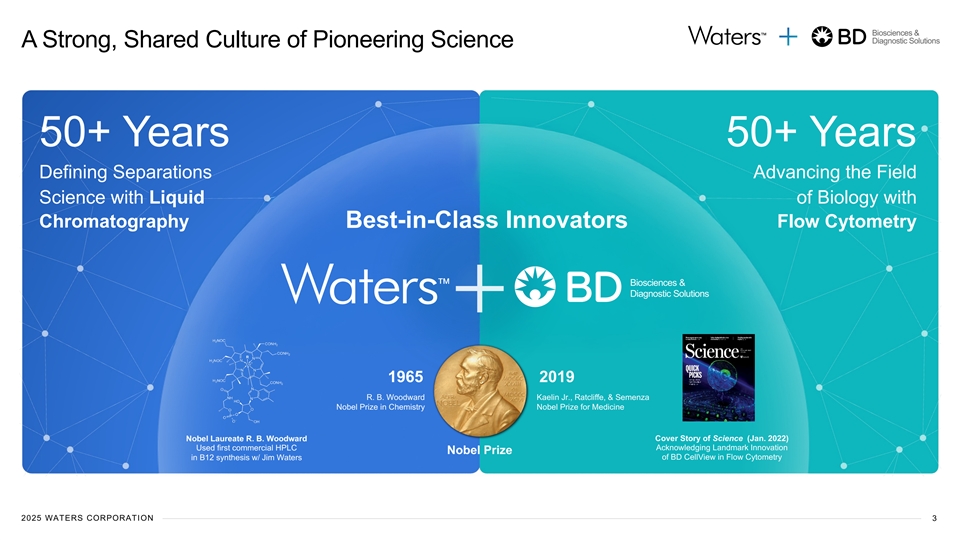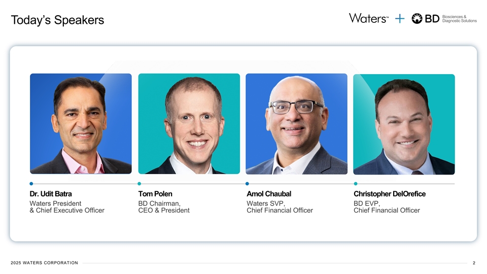 Biosciences & Diagnostic Solutions Today’s Speakers Dr. Udit Batra Tom Polen Amol Chaubal Christopher DelOrefice Waters President BD Chairman, Waters SVP, BD EVP, & Chief Executive Officer CEO & President Chief Financial Officer Chief Financial Officer 2025 WATERS CORPORATION 2