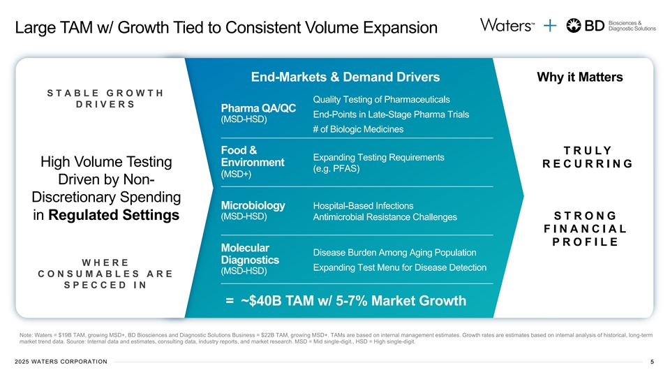 Biosciences & Diagnostic Solutions A Significant Value Creation Opportunity Creates an Innovation Leader …Serving High Volume, Regulated with Robust Financial Strength… Applications w/ Industry-Leading Brands Large TAM w/ Consistent Growth Drivers 1 Doubles Waters TAM to ~$40B at 5-7% growth in a broader range of regulated 1 sources Strong Strategic Fit Immediate commercial impact from Waters’ proven execution model 2 Accelerates multiple high-growth adjacencies at once Biosciences & Diagnostic Solutions Increases Growth Stability 3 >70% of revenue annually recurring + >50% instruments replaced every 5-10 yrs ~ ~ ~ $6.5B $2.0B 16K An Industry-Leading Financial Outlook 2 Revenue (Pro Forma CY 25E) Adj. EBITDA (Pro Forma CY-25E) Employees Significant cost & revenue synergies w/ rapid path to flagship margin profile 4 3 Expected MSD-HSD revenue & Mid-Teens EPS growth ~ Milford, MA NYSE:WAT 10% R&D as % of Sales Headquarters Ticker Note: 1. TAM = Total Addressable Market and is based on internal management estimates. 2; 3. Statements denotes expectations on a projected and adjusted pro forma operating margin and EPS basis. 2025 WATERS CORPORATION 4