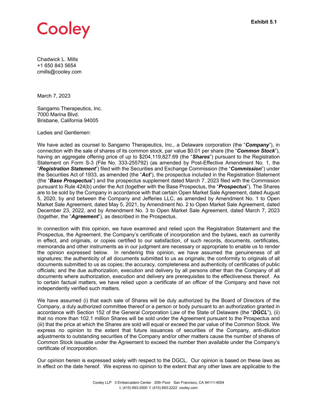 Exhibit 5.1 Chadwick L. Mills +1 650 843 5654 cmills@cooley.com Cooley LLP 3 Embarcadero Center 20th Floor San Francisco, CA 94111-4004 t: (415) 693-2000 f: (415) 693-2222 cooley.com March 7, 2023 Sangamo Therapeutics, Inc. 7000 Marina Blvd. Brisbane, California 94005 Ladies and Gentlemen: We have acted as counsel to Sangamo Therapeutics, Inc., a Delaware corporation (the “Company”), in connection with the sale of shares of its common stock, par value $0.01 per share (the “Common Stock”), having an aggregate offering price of up to $204,119,827.69 (the “Shares”) pursuant to the Registration Statement on Form S-3 (File No. 333-255792) (as amended by Post-Effective Amendment No. 1, the “Registration Statement”) filed with the Securities and Exchange Commission (the “Commission”) under the Securities Act of 1933, as amended (the “Act”), the prospectus included in the Registration Statement (the “Base Prospectus”) and the prospectus supplement dated March 7, 2023 filed with the Commission pursuant to Rule 424(b) under the Act (together with the Base Prospectus, the “Prospectus”). The Shares are to be sold by the Company in accordance with that certain Open Market Sale Agreement, dated August 5, 2020, by and between the Company and Jefferies LLC, as amended by Amendment No. 1 to Open Market Sale Agreement, dated May 5, 2021, by Amendment No. 2 to Open Market Sale Agreement, dated December 23, 2022, and by Amendment No. 3 to Open Market Sale Agreement, dated March 7, 2023 (together, the “Agreement”), as described in the Prospectus. In connection with this opinion, we have examined and relied upon the Registration Statement and the Prospectus, the Agreement, the Company’s certificate of incorporation and the bylaws, each as currently in effect, and originals, or copies certified to our satisfaction, of such records, documents, certificates, memoranda and other instruments as in our judgment are necessary or appropriate to enable us to render the opinion expressed below. In rendering this opinion, we have assumed the genuineness of all signatures; the authenticity of all documents submitted to us as originals; the conformity to originals of all documents submitted to us as copies; the accuracy, completeness and authenticity of certificates of public officials; and the due authorization, execution and delivery by all persons other than the Company of all documents where authorization, execution and delivery are prerequisites to the effectiveness thereof. As to certain factual matters, we have relied upon a certificate of an officer of the Company and have not independently verified such matters. We have assumed (i) that each sale of Shares will be duly authorized by the Board of Directors of the Company, a duly authorized committee thereof or a person or body pursuant to an authorization granted in accordance with Section 152 of the General Corporation Law of the State of Delaware (the “DGCL”), (ii) that no more than 102.1 million Shares will be sold under the Agreement pursuant to the Prospectus and (iii) that the price at which the Shares are sold will equal or exceed the par value of the Common Stock. We express no opinion to the extent that future issuances of securities of the Company, anti-dilution adjustments to outstanding securities of the Company and/or other matters cause the number of shares of Common Stock issuable under the Agreement to exceed the number then available under the Company’s certificate of incorporation. Our opinion herein is expressed solely with respect to the DGCL. Our opinion is based on these laws as in effect on the date hereof. We express no opinion to the extent that any other laws are applicable to the