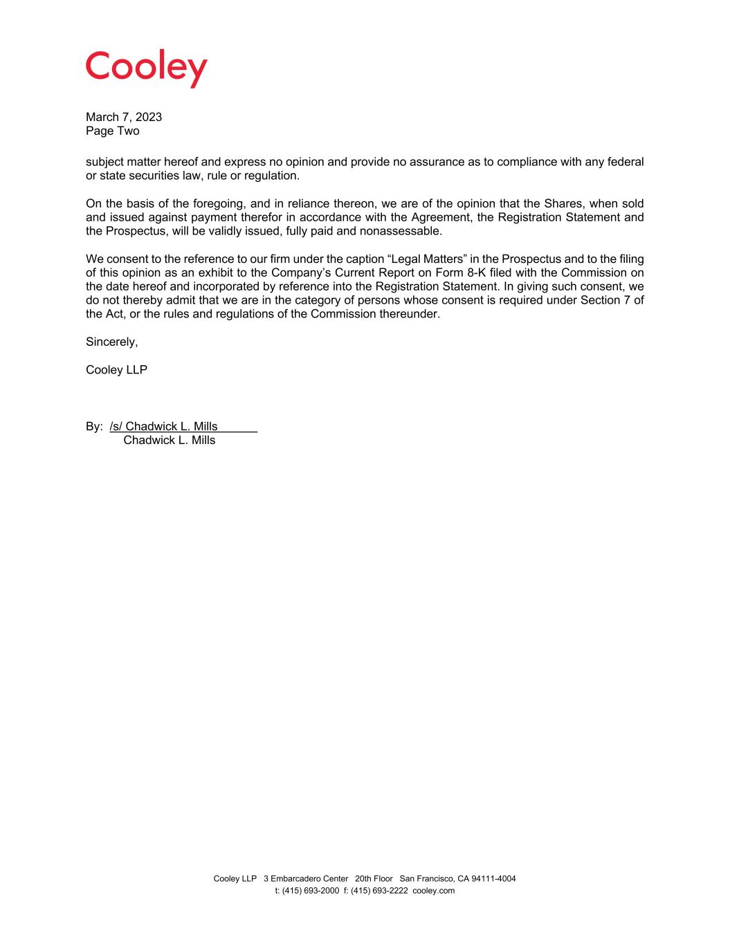 March 7, 2023 Page Two Cooley LLP 3 Embarcadero Center 20th Floor San Francisco, CA 94111-4004 t: (415) 693-2000 f: (415) 693-2222 cooley.com subject matter hereof and express no opinion and provide no assurance as to compliance with any federal or state securities law, rule or regulation. On the basis of the foregoing, and in reliance thereon, we are of the opinion that the Shares, when sold and issued against payment therefor in accordance with the Agreement, the Registration Statement and the Prospectus, will be validly issued, fully paid and nonassessable. We consent to the reference to our firm under the caption “Legal Matters” in the Prospectus and to the filing of this opinion as an exhibit to the Company’s Current Report on Form 8-K filed with the Commission on the date hereof and incorporated by reference into the Registration Statement. In giving such consent, we do not thereby admit that we are in the category of persons whose consent is required under Section 7 of the Act, or the rules and regulations of the Commission thereunder. Sincerely, Cooley LLP By: /s/ Chadwick L. Mills Chadwick L. Mills