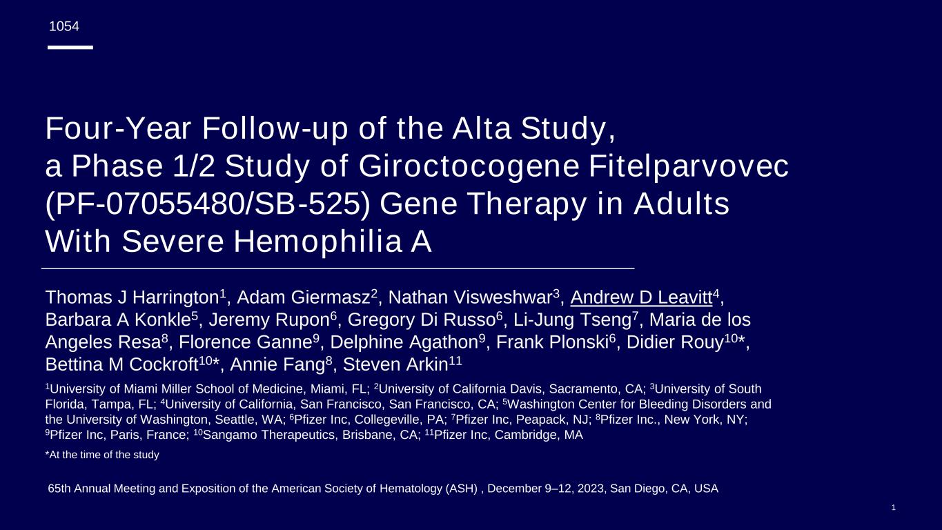 1 65th Annual Meeting and Exposition of the American Society of Hematology (ASH) , December 9–12, 2023, San Diego, CA, USA Four-Year Follow-up of the Alta Study, a Phase 1/2 Study of Giroctocogene Fitelparvovec (PF-07055480/SB-525) Gene Therapy in Adults With Severe Hemophilia A Thomas J Harrington1, Adam Giermasz2, Nathan Visweshwar3, Andrew D Leavitt4, Barbara A Konkle5, Jeremy Rupon6, Gregory Di Russo6, Li-Jung Tseng7, Maria de los Angeles Resa8, Florence Ganne9, Delphine Agathon9, Frank Plonski6, Didier Rouy10*, Bettina M Cockroft10*, Annie Fang8, Steven Arkin11 1University of Miami Miller School of Medicine, Miami, FL; 2University of California Davis, Sacramento, CA; 3University of South Florida, Tampa, FL; 4University of California, San Francisco, San Francisco, CA; 5Washington Center for Bleeding Disorders and the University of Washington, Seattle, WA; 6Pfizer Inc, Collegeville, PA; 7Pfizer Inc, Peapack, NJ; 8Pfizer Inc., New York, NY; 9Pfizer Inc, Paris, France; 10Sangamo Therapeutics, Brisbane, CA; 11Pfizer Inc, Cambridge, MA *At the time of the study 1054