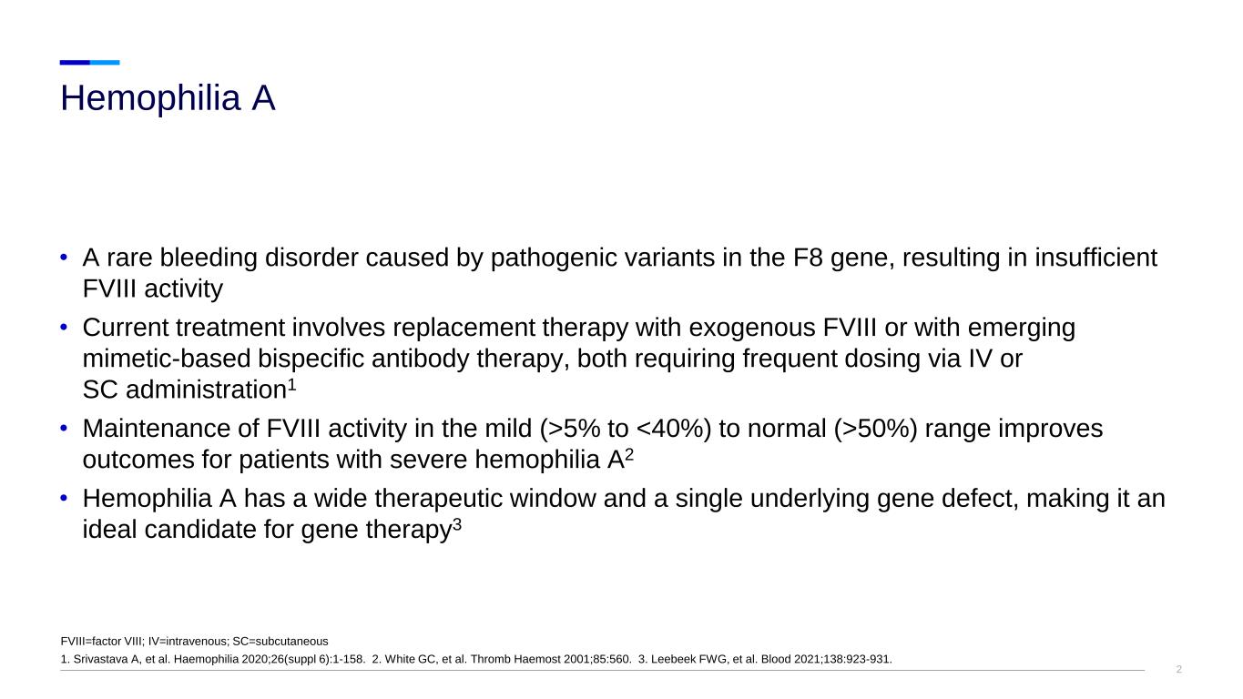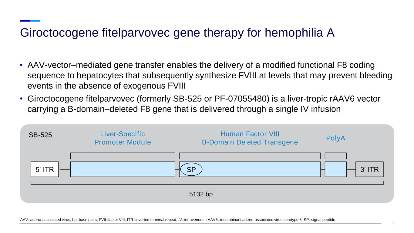 2 • A rare bleeding disorder caused by pathogenic variants in the F8 gene, resulting in insufficient FVIII activity • Current treatment involves replacement therapy with exogenous FVIII or with emerging mimetic-based bispecific antibody therapy, both requiring frequent dosing via IV or SC administration1 • Maintenance of FVIII activity in the mild (>5% to <40%) to normal (>50%) range improves outcomes for patients with severe hemophilia A2 • Hemophilia A has a wide therapeutic window and a single underlying gene defect, making it an ideal candidate for gene therapy3 Hemophilia A FVIII=factor VIII; IV=intravenous; SC=subcutaneous 1. Srivastava A, et al. Haemophilia 2020;26(suppl 6):1-158. 2. White GC, et al. Thromb Haemost 2001;85:560. 3. Leebeek FWG, et al. Blood 2021;138:923-931.