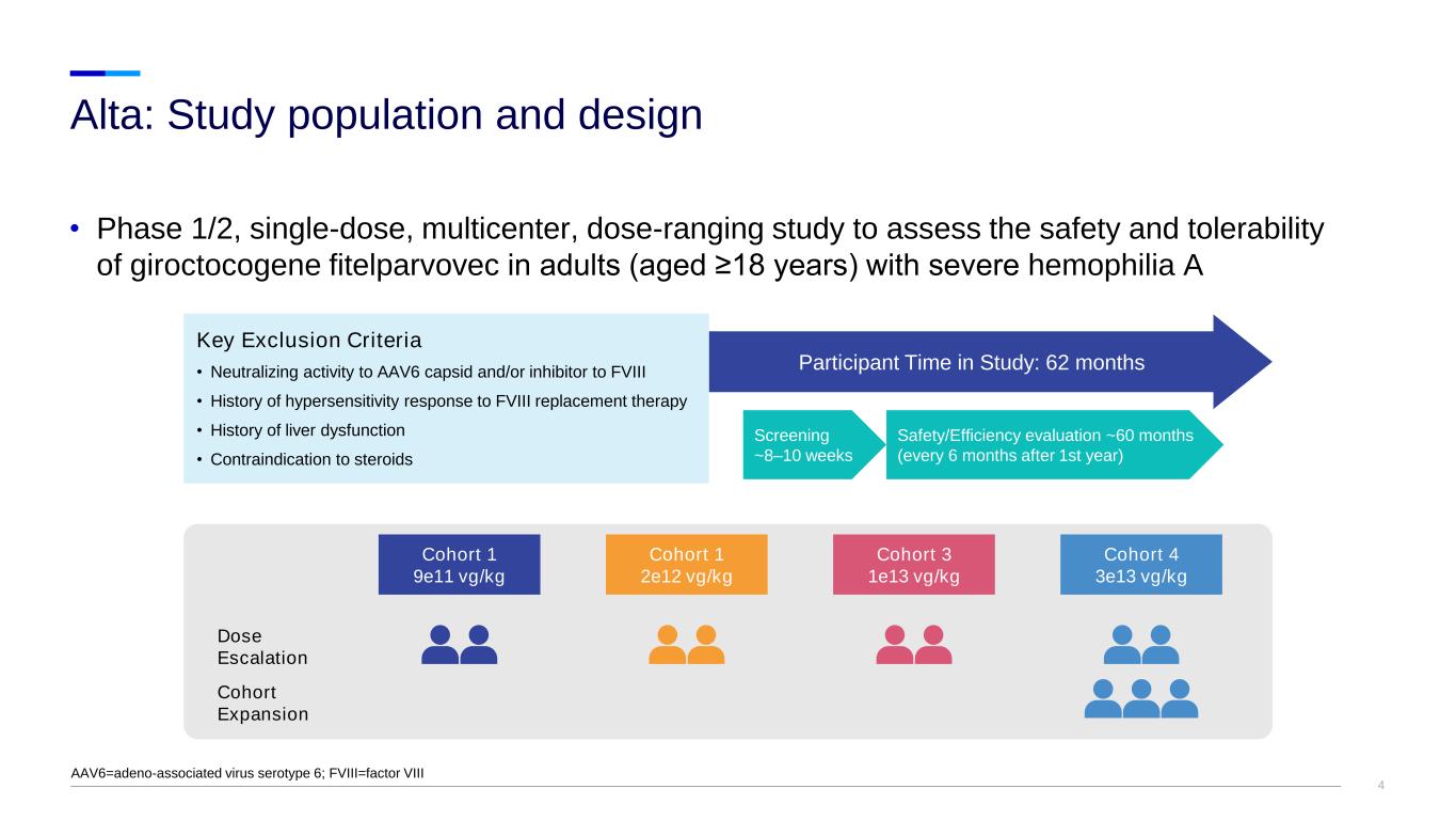 3 • AAV-vector–mediated gene transfer enables the delivery of a modified functional F8 coding sequence to hepatocytes that subsequently synthesize FVIII at levels that may prevent bleeding events in the absence of exogenous FVIII • Giroctocogene fitelparvovec (formerly SB-525 or PF-07055480) is a liver-tropic rAAV6 vector carrying a B-domain–deleted F8 gene that is delivered through a single IV infusion Giroctocogene fitelparvovec gene therapy for hemophilia A AAV=adeno-associated virus; bp=base pairs; FVII=factor VIII; ITR=inverted terminal repeat; IV=intravenous; rAAV6=recombinant adeno-associated virus serotype 6; SP=signal peptide SB-525 Liver-Specific Promoter Module 5’ ITR Human Factor VIII B-Domain Deleted Transgene PolyA 5132 bp 3’ ITRSP