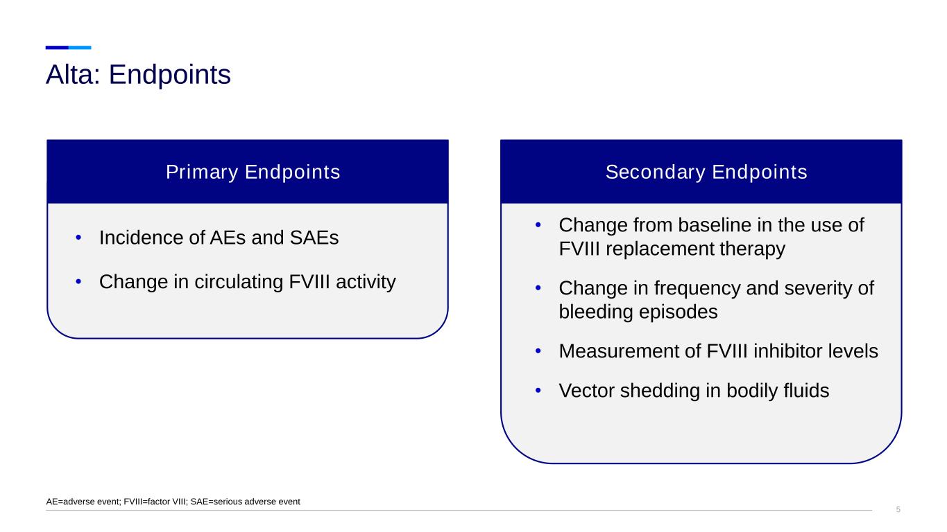 4 • Phase 1/2, single-dose, multicenter, dose-ranging study to assess the safety and tolerability of giroctocogene fitelparvovec in adults (aged ≥18 years) with severe hemophilia A Alta: Study population and design AAV6=adeno-associated virus serotype 6; FVIII=factor VIII Key Exclusion Criteria • Neutralizing activity to AAV6 capsid and/or inhibitor to FVIII • History of hypersensitivity response to FVIII replacement therapy • History of liver dysfunction • Contraindication to steroids Participant Time in Study: 62 months Screening ~8–10 weeks Safety/Efficiency evaluation ~60 months (every 6 months after 1st year) Dose Escalation Cohort Expansion Cohort 1 9e11 vg/kg Cohort 1 2e12 vg/kg Cohort 3 1e13 vg/kg Cohort 4 3e13 vg/kg
