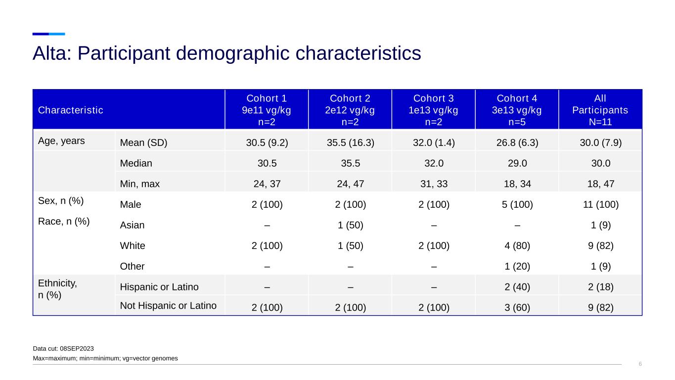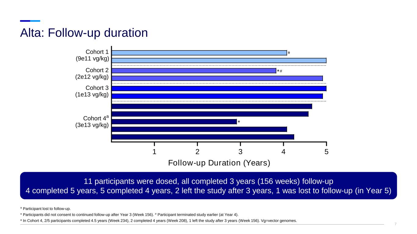 6 Characteristic Cohort 1 9e11 vg/kg n=2 Cohort 2 2e12 vg/kg n=2 Cohort 3 1e13 vg/kg n=2 Cohort 4 3e13 vg/kg n=5 All Participants N=11 Age, years Mean (SD) 30.5 (9.2) 35.5 (16.3) 32.0 (1.4) 26.8 (6.3) 30.0 (7.9) Median 30.5 35.5 32.0 29.0 30.0 Min, max 24, 37 24, 47 31, 33 18, 34 18, 47 Sex, n (%) Male 2 (100) 2 (100) 2 (100) 5 (100) 11 (100) Race, n (%) Asian – 1 (50) – – 1 (9) White 2 (100) 1 (50) 2 (100) 4 (80) 9 (82) Other – – – 1 (20) 1 (9) Ethnicity, n (%) Hispanic or Latino – – – 2 (40) 2 (18) Not Hispanic or Latino 2 (100) 2 (100) 2 (100) 3 (60) 9 (82) Alta: Participant demographic characteristics Data cut: 08SEP2023 Max=maximum; min=minimum; vg=vector genomes