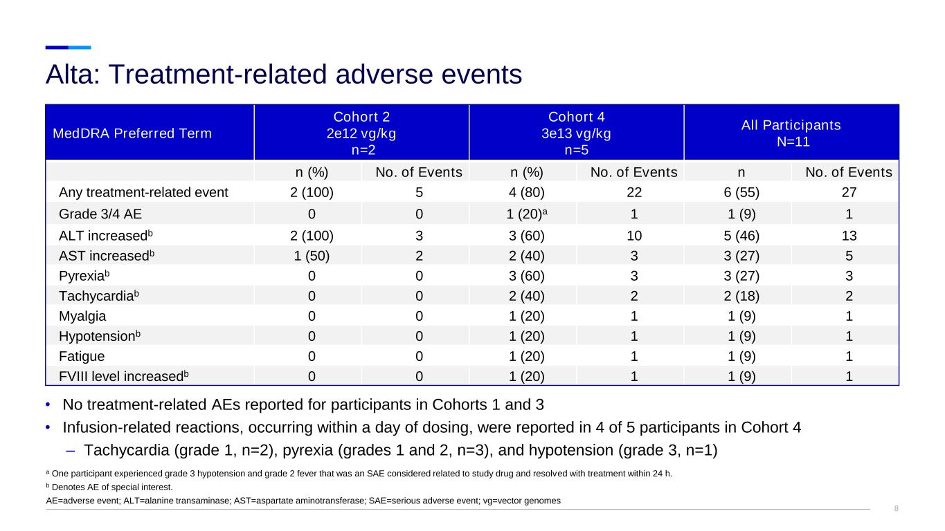 7 11 participants were dosed, all completed 3 years (156 weeks) follow-up 4 completed 5 years, 5 completed 4 years, 2 left the study after 3 years, 1 was lost to follow-up (in Year 5) Alta: Follow-up duration ǂ Participant lost to follow-up. * Participants did not consent to continued follow-up after Year 3 (Week 156). # Participant terminated study earlier (at Year 4). a In Cohort 4, 2/5 participants completed 4.5 years (Week 234), 2 completed 4 years (Week 208), 1 left the study after 3 years (Week 156). Vg=vector genomes. Follow-up Duration (Years) Cohort 1 (9e11 vg/kg) Cohort 2 (2e12 vg/kg) Cohort 3 (1e13 vg/kg) Cohort 4a (3e13 vg/kg) * * # 1 2 3 4 5 ǂ