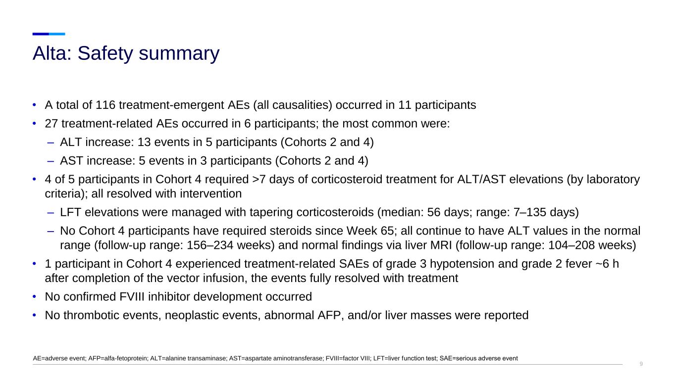 8 MedDRA Preferred Term Cohort 2 2e12 vg/kg n=2 Cohort 4 3e13 vg/kg n=5 All Participants N=11 n (%) No. of Events n (%) No. of Events n No. of Events Any treatment-related event 2 (100) 5 4 (80) 22 6 (55) 27 Grade 3/4 AE 0 0 1 (20)a 1 1 (9) 1 ALT increasedb 2 (100) 3 3 (60) 10 5 (46) 13 AST increasedb 1 (50) 2 2 (40) 3 3 (27) 5 Pyrexiab 0 0 3 (60) 3 3 (27) 3 Tachycardiab 0 0 2 (40) 2 2 (18) 2 Myalgia 0 0 1 (20) 1 1 (9) 1 Hypotensionb 0 0 1 (20) 1 1 (9) 1 Fatigue 0 0 1 (20) 1 1 (9) 1 FVIII level increasedb 0 0 1 (20) 1 1 (9) 1 • No treatment-related AEs reported for participants in Cohorts 1 and 3 • Infusion-related reactions, occurring within a day of dosing, were reported in 4 of 5 participants in Cohort 4 – Tachycardia (grade 1, n=2), pyrexia (grades 1 and 2, n=3), and hypotension (grade 3, n=1) Alta: Treatment-related adverse events a One participant experienced grade 3 hypotension and grade 2 fever that was an SAE considered related to study drug and resolved with treatment within 24 h. b Denotes AE of special interest. AE=adverse event; ALT=alanine transaminase; AST=aspartate aminotransferase; SAE=serious adverse event; vg=vector genomes