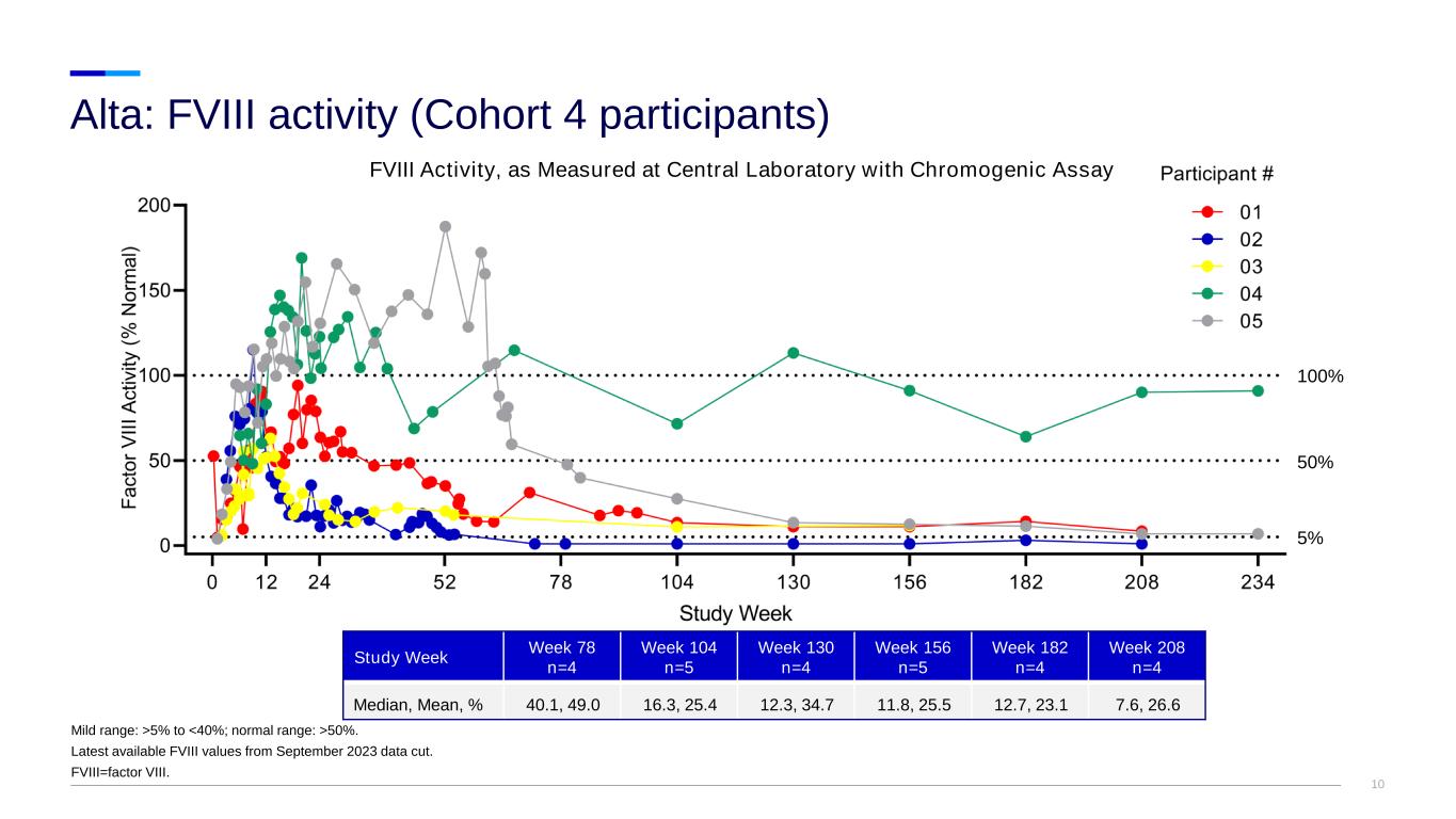 9 • A total of 116 treatment-emergent AEs (all causalities) occurred in 11 participants • 27 treatment-related AEs occurred in 6 participants; the most common were: – ALT increase: 13 events in 5 participants (Cohorts 2 and 4) – AST increase: 5 events in 3 participants (Cohorts 2 and 4) • 4 of 5 participants in Cohort 4 required >7 days of corticosteroid treatment for ALT/AST elevations (by laboratory criteria); all resolved with intervention – LFT elevations were managed with tapering corticosteroids (median: 56 days; range: 7–135 days) – No Cohort 4 participants have required steroids since Week 65; all continue to have ALT values in the normal range (follow-up range: 156–234 weeks) and normal findings via liver MRI (follow-up range: 104–208 weeks) • 1 participant in Cohort 4 experienced treatment-related SAEs of grade 3 hypotension and grade 2 fever ~6 h after completion of the vector infusion, the events fully resolved with treatment • No confirmed FVIII inhibitor development occurred • No thrombotic events, neoplastic events, abnormal AFP, and/or liver masses were reported Alta: Safety summary AE=adverse event; AFP=alfa-fetoprotein; ALT=alanine transaminase; AST=aspartate aminotransferase; FVIII=factor VIII; LFT=liver function test; SAE=serious adverse event​