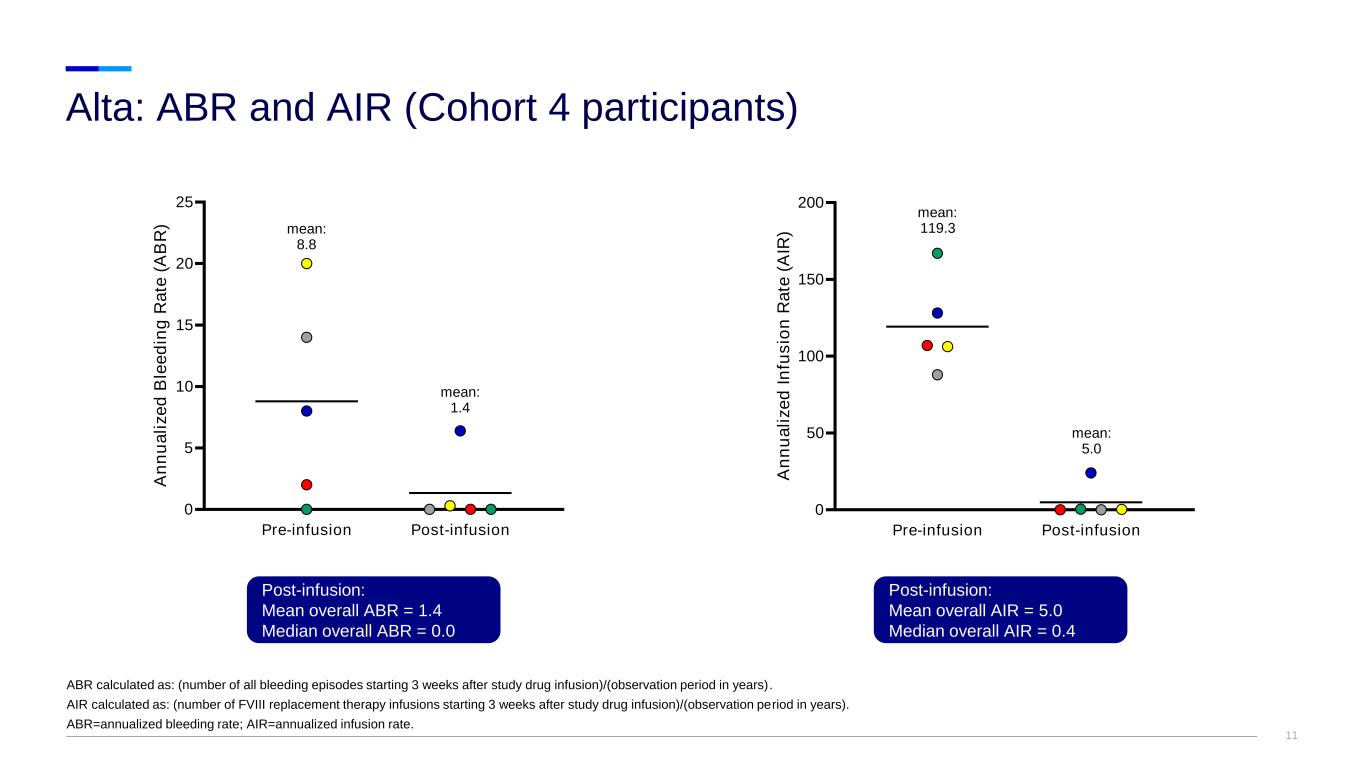 10 Alta: FVIII activity (Cohort 4 participants) Mild range: >5% to <40%; normal range: >50%. Latest available FVIII values from September 2023 data cut. FVIII=factor VIII. FVIII Activity, as Measured at Central Laboratory with Chromogenic Assay 5% 50% 100% Study Week Week 78 n=4 Week 104 n=5 Week 130 n=4 Week 156 n=5 Week 182 n=4 Week 208 n=4 Median, Mean, % 40.1, 49.0 16.3, 25.4 12.3, 34.7 11.8, 25.5 12.7, 23.1 7.6, 26.6
