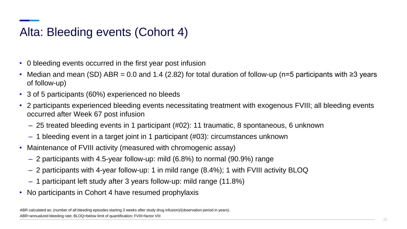 11 Post-infusion: Mean overall ABR = 1.4 Median overall ABR = 0.0 Post-infusion: Mean overall AIR = 5.0 Median overall AIR = 0.4 Alta: ABR and AIR (Cohort 4 participants) ABR calculated as: (number of all bleeding episodes starting 3 weeks after study drug infusion)/(observation period in years). AIR calculated as: (number of FVIII replacement therapy infusions starting 3 weeks after study drug infusion)/(observation period in years). ABR=annualized bleeding rate; AIR=annualized infusion rate. Pre-infusion Post-infusion 0 50 100 150 200 A n n u a li z e d I n fu s io n R a te ( A IR ) mean: 119.3 mean: 5.0 Pre-infusion Post-infusion 0 5 10 15 20 25 A n n u a li z e d B le e d in g R a te ( A B R ) mean: 8.8 mean: 1.4