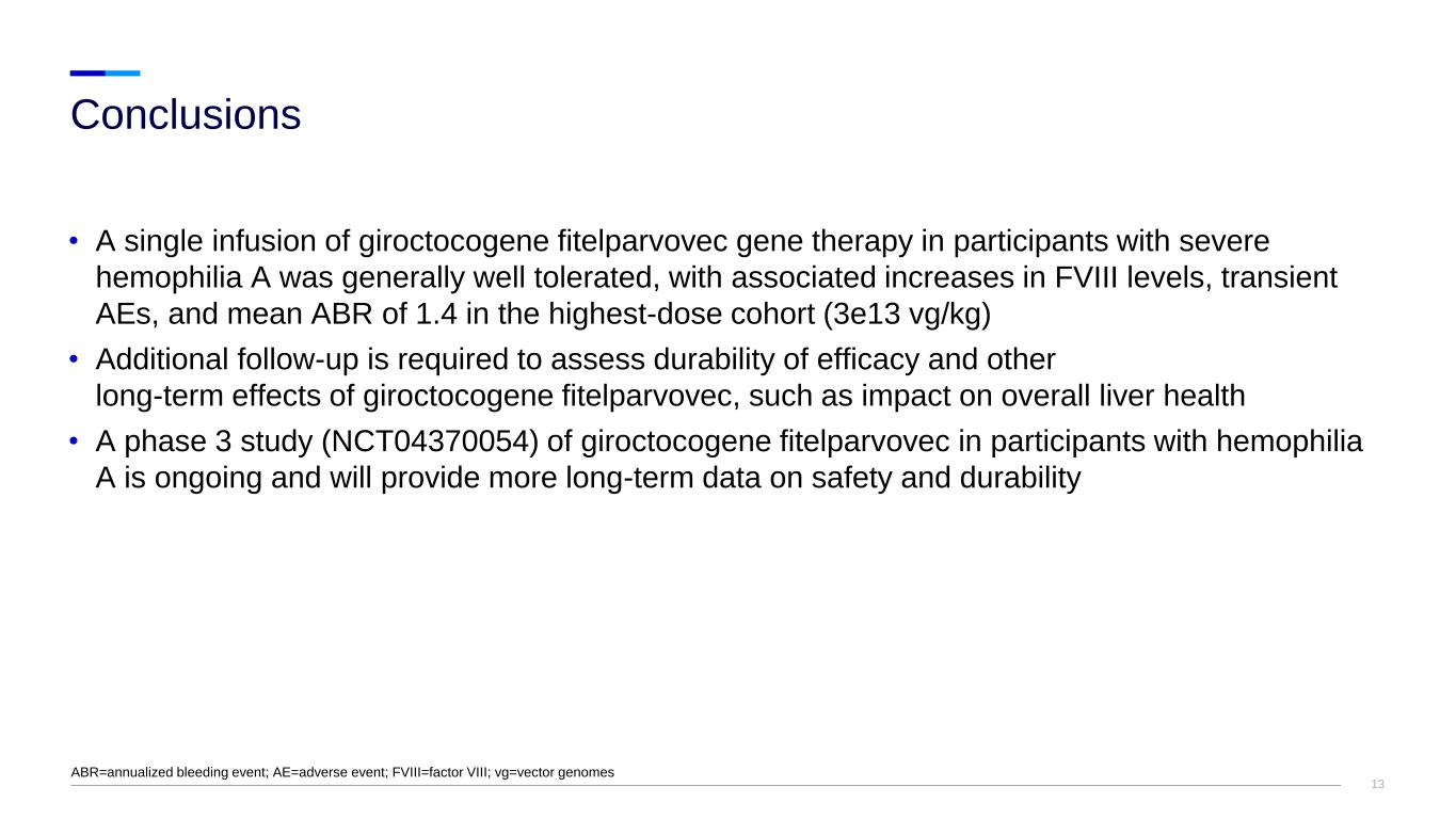 13 • A single infusion of giroctocogene fitelparvovec gene therapy in participants with severe hemophilia A was generally well tolerated, with associated increases in FVIII levels, transient AEs, and mean ABR of 1.4 in the highest-dose cohort (3e13 vg/kg) • Additional follow-up is required to assess durability of efficacy and other long-term effects of giroctocogene fitelparvovec, such as impact on overall liver health • A phase 3 study (NCT04370054) of giroctocogene fitelparvovec in participants with hemophilia A is ongoing and will provide more long-term data on safety and durability Conclusions ABR=annualized bleeding event; AE=adverse event; FVIII=factor VIII; vg=vector genomes