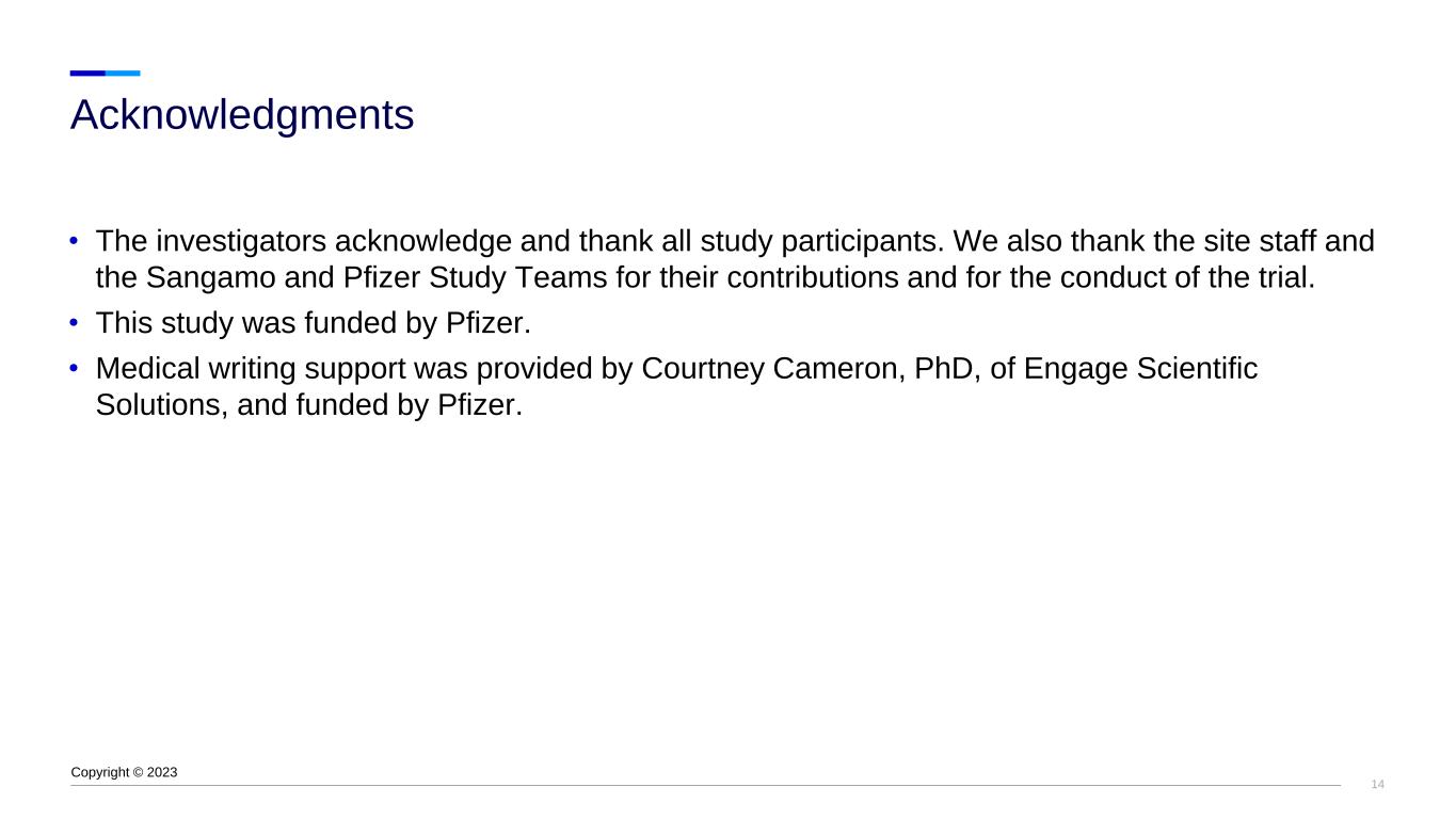 14 • The investigators acknowledge and thank all study participants. We also thank the site staff and the Sangamo and Pfizer Study Teams for their contributions and for the conduct of the trial. • This study was funded by Pfizer. • Medical writing support was provided by Courtney Cameron, PhD, of Engage Scientific Solutions, and funded by Pfizer. Acknowledgments Copyright © 2023