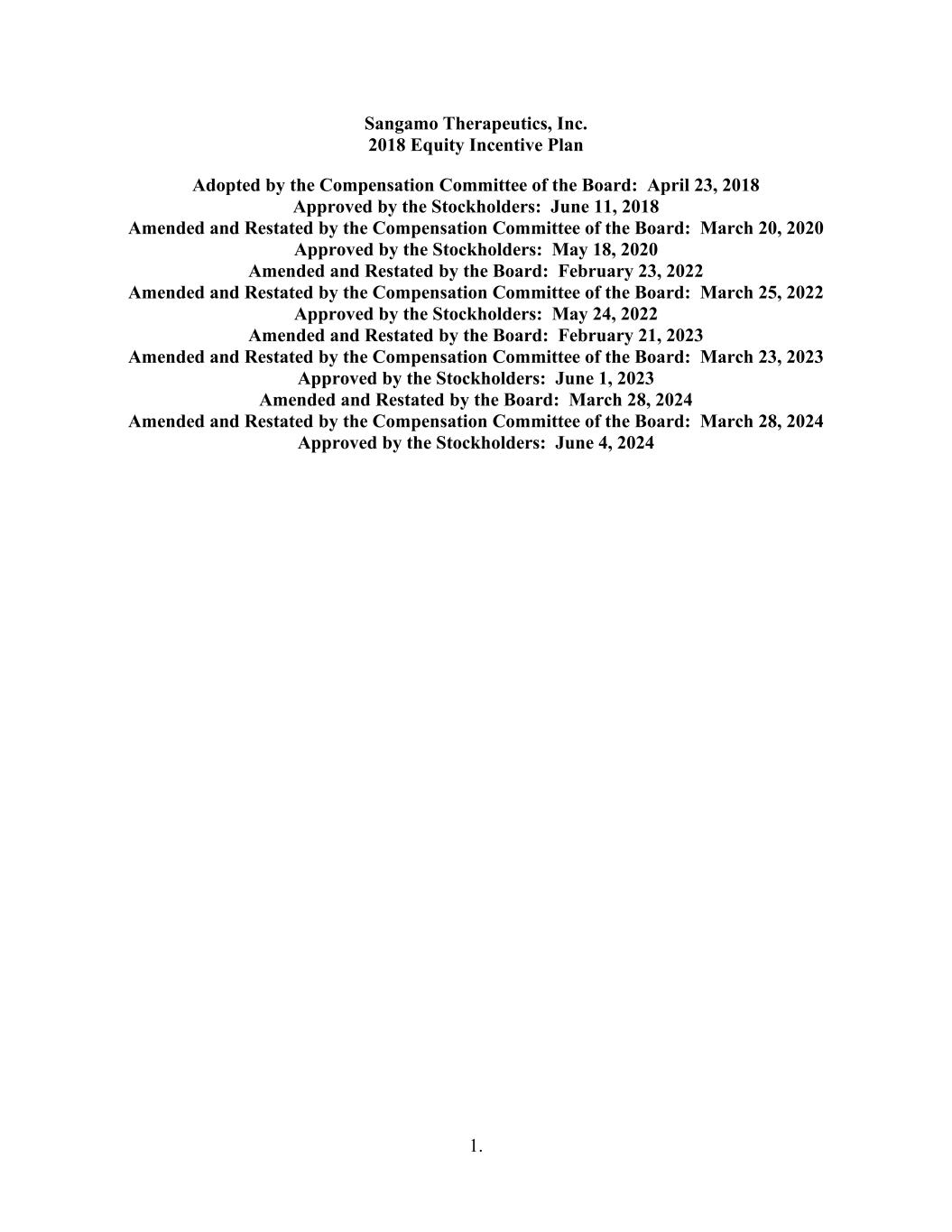 1. Sangamo Therapeutics, Inc. 2018 Equity Incentive Plan Adopted by the Compensation Committee of the Board: April 23, 2018 Approved by the Stockholders: June 11, 2018 Amended and Restated by the Compensation Committee of the Board: March 20, 2020 Approved by the Stockholders: May 18, 2020 Amended and Restated by the Board: February 23, 2022 Amended and Restated by the Compensation Committee of the Board: March 25, 2022 Approved by the Stockholders: May 24, 2022 Amended and Restated by the Board: February 21, 2023 Amended and Restated by the Compensation Committee of the Board: March 23, 2023 Approved by the Stockholders: June 1, 2023 Amended and Restated by the Board: March 28, 2024 Amended and Restated by the Compensation Committee of the Board: March 28, 2024 Approved by the Stockholders: June 4, 2024