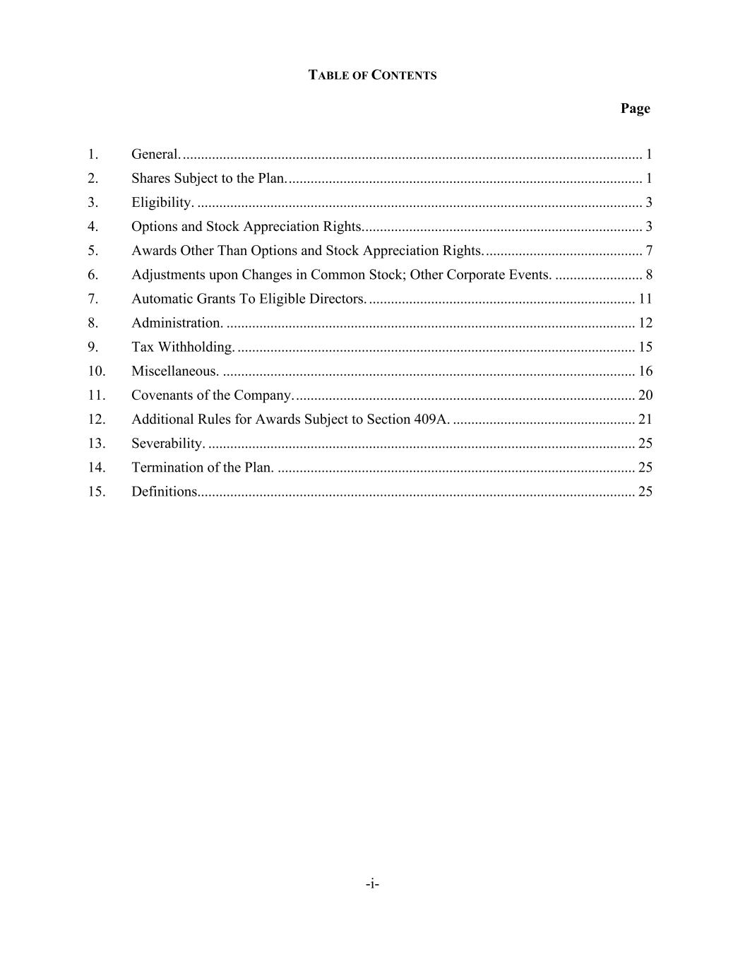TABLE OF CONTENTS Page -i- 1. General. .............................................................................................................................. 1 2. Shares Subject to the Plan. ................................................................................................. 1 3. Eligibility. .......................................................................................................................... 3 4. Options and Stock Appreciation Rights. ............................................................................ 3 5. Awards Other Than Options and Stock Appreciation Rights. ........................................... 7 6. Adjustments upon Changes in Common Stock; Other Corporate Events. ........................ 8 7. Automatic Grants To Eligible Directors. ......................................................................... 11 8. Administration. ................................................................................................................ 12 9. Tax Withholding. ............................................................................................................. 15 10. Miscellaneous. ................................................................................................................. 16 11. Covenants of the Company. ............................................................................................. 20 12. Additional Rules for Awards Subject to Section 409A. .................................................. 21 13. Severability. ..................................................................................................................... 25 14. Termination of the Plan. .................................................................................................. 25 15. Definitions........................................................................................................................ 25