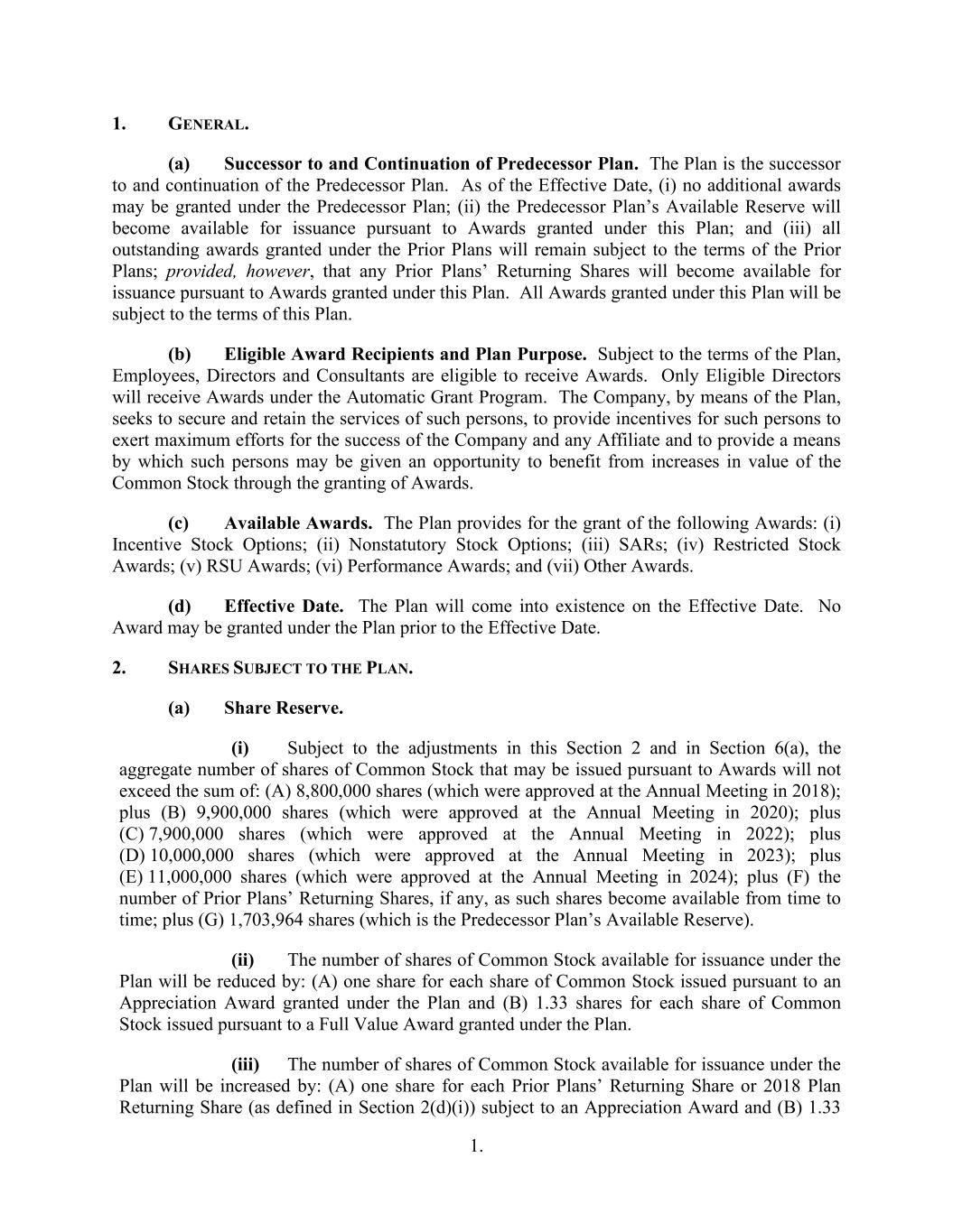 1. 1. GENERAL. (a) Successor to and Continuation of Predecessor Plan. The Plan is the successor to and continuation of the Predecessor Plan. As of the Effective Date, (i) no additional awards may be granted under the Predecessor Plan; (ii) the Predecessor Plan’s Available Reserve will become available for issuance pursuant to Awards granted under this Plan; and (iii) all outstanding awards granted under the Prior Plans will remain subject to the terms of the Prior Plans; provided, however, that any Prior Plans’ Returning Shares will become available for issuance pursuant to Awards granted under this Plan. All Awards granted under this Plan will be subject to the terms of this Plan. (b) Eligible Award Recipients and Plan Purpose. Subject to the terms of the Plan, Employees, Directors and Consultants are eligible to receive Awards. Only Eligible Directors will receive Awards under the Automatic Grant Program. The Company, by means of the Plan, seeks to secure and retain the services of such persons, to provide incentives for such persons to exert maximum efforts for the success of the Company and any Affiliate and to provide a means by which such persons may be given an opportunity to benefit from increases in value of the Common Stock through the granting of Awards. (c) Available Awards. The Plan provides for the grant of the following Awards: (i) Incentive Stock Options; (ii) Nonstatutory Stock Options; (iii) SARs; (iv) Restricted Stock Awards; (v) RSU Awards; (vi) Performance Awards; and (vii) Other Awards. (d) Effective Date. The Plan will come into existence on the Effective Date. No Award may be granted under the Plan prior to the Effective Date. 2. SHARES SUBJECT TO THE PLAN. (a) Share Reserve. (i) Subject to the adjustments in this Section 2 and in Section 6(a), the aggregate number of shares of Common Stock that may be issued pursuant to Awards will not exceed the sum of: (A) 8,800,000 shares (which were approved at the Annual Meeting in 2018); plus (B) 9,900,000 shares (which were approved at the Annual Meeting in 2020); plus (C) 7,900,000 shares (which were approved at the Annual Meeting in 2022); plus (D) 10,000,000 shares (which were approved at the Annual Meeting in 2023); plus (E) 11,000,000 shares (which were approved at the Annual Meeting in 2024); plus (F) the number of Prior Plans’ Returning Shares, if any, as such shares become available from time to time; plus (G) 1,703,964 shares (which is the Predecessor Plan’s Available Reserve). (ii) The number of shares of Common Stock available for issuance under the Plan will be reduced by: (A) one share for each share of Common Stock issued pursuant to an Appreciation Award granted under the Plan and (B) 1.33 shares for each share of Common Stock issued pursuant to a Full Value Award granted under the Plan. (iii) The number of shares of Common Stock available for issuance under the Plan will be increased by: (A) one share for each Prior Plans’ Returning Share or 2018 Plan Returning Share (as defined in Section 2(d)(i)) subject to an Appreciation Award and (B) 1.33