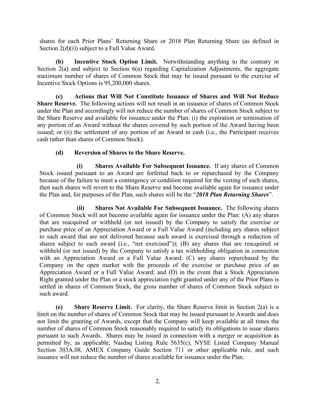 2. shares for each Prior Plans’ Returning Share or 2018 Plan Returning Share (as defined in Section 2(d)(i)) subject to a Full Value Award. (b) Incentive Stock Option Limit. Notwithstanding anything to the contrary in Section 2(a) and subject to Section 6(a) regarding Capitalization Adjustments, the aggregate maximum number of shares of Common Stock that may be issued pursuant to the exercise of Incentive Stock Options is 95,200,000 shares. (c) Actions that Will Not Constitute Issuance of Shares and Will Not Reduce Share Reserve. The following actions will not result in an issuance of shares of Common Stock under the Plan and accordingly will not reduce the number of shares of Common Stock subject to the Share Reserve and available for issuance under the Plan: (i) the expiration or termination of any portion of an Award without the shares covered by such portion of the Award having been issued; or (ii) the settlement of any portion of an Award in cash (i.e., the Participant receives cash rather than shares of Common Stock). (d) Reversion of Shares to the Share Reserve. (i) Shares Available For Subsequent Issuance. If any shares of Common Stock issued pursuant to an Award are forfeited back to or repurchased by the Company because of the failure to meet a contingency or condition required for the vesting of such shares, then such shares will revert to the Share Reserve and become available again for issuance under the Plan and, for purposes of the Plan, such shares will be the “2018 Plan Returning Shares”. (ii) Shares Not Available For Subsequent Issuance. The following shares of Common Stock will not become available again for issuance under the Plan: (A) any shares that are reacquired or withheld (or not issued) by the Company to satisfy the exercise or purchase price of an Appreciation Award or a Full Value Award (including any shares subject to such award that are not delivered because such award is exercised through a reduction of shares subject to such award (i.e., “net exercised”)); (B) any shares that are reacquired or withheld (or not issued) by the Company to satisfy a tax withholding obligation in connection with an Appreciation Award or a Full Value Award; (C) any shares repurchased by the Company on the open market with the proceeds of the exercise or purchase price of an Appreciation Award or a Full Value Award; and (D) in the event that a Stock Appreciation Right granted under the Plan or a stock appreciation right granted under any of the Prior Plans is settled in shares of Common Stock, the gross number of shares of Common Stock subject to such award. (e) Share Reserve Limit. For clarity, the Share Reserve limit in Section 2(a) is a limit on the number of shares of Common Stock that may be issued pursuant to Awards and does not limit the granting of Awards, except that the Company will keep available at all times the number of shares of Common Stock reasonably required to satisfy its obligations to issue shares pursuant to such Awards. Shares may be issued in connection with a merger or acquisition as permitted by, as applicable, Nasdaq Listing Rule 5635(c), NYSE Listed Company Manual Section 303A.08, AMEX Company Guide Section 711 or other applicable rule, and such issuance will not reduce the number of shares available for issuance under the Plan.