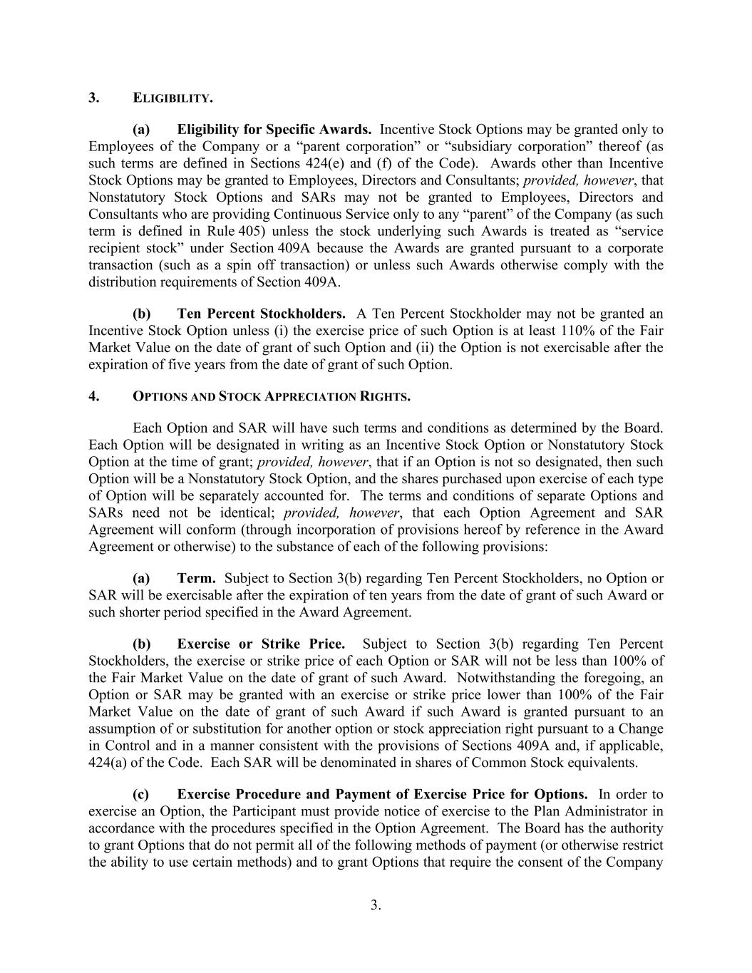 3. 3. ELIGIBILITY. (a) Eligibility for Specific Awards. Incentive Stock Options may be granted only to Employees of the Company or a “parent corporation” or “subsidiary corporation” thereof (as such terms are defined in Sections 424(e) and (f) of the Code). Awards other than Incentive Stock Options may be granted to Employees, Directors and Consultants; provided, however, that Nonstatutory Stock Options and SARs may not be granted to Employees, Directors and Consultants who are providing Continuous Service only to any “parent” of the Company (as such term is defined in Rule 405) unless the stock underlying such Awards is treated as “service recipient stock” under Section 409A because the Awards are granted pursuant to a corporate transaction (such as a spin off transaction) or unless such Awards otherwise comply with the distribution requirements of Section 409A. (b) Ten Percent Stockholders. A Ten Percent Stockholder may not be granted an Incentive Stock Option unless (i) the exercise price of such Option is at least 110% of the Fair Market Value on the date of grant of such Option and (ii) the Option is not exercisable after the expiration of five years from the date of grant of such Option. 4. OPTIONS AND STOCK APPRECIATION RIGHTS. Each Option and SAR will have such terms and conditions as determined by the Board. Each Option will be designated in writing as an Incentive Stock Option or Nonstatutory Stock Option at the time of grant; provided, however, that if an Option is not so designated, then such Option will be a Nonstatutory Stock Option, and the shares purchased upon exercise of each type of Option will be separately accounted for. The terms and conditions of separate Options and SARs need not be identical; provided, however, that each Option Agreement and SAR Agreement will conform (through incorporation of provisions hereof by reference in the Award Agreement or otherwise) to the substance of each of the following provisions: (a) Term. Subject to Section 3(b) regarding Ten Percent Stockholders, no Option or SAR will be exercisable after the expiration of ten years from the date of grant of such Award or such shorter period specified in the Award Agreement. (b) Exercise or Strike Price. Subject to Section 3(b) regarding Ten Percent Stockholders, the exercise or strike price of each Option or SAR will not be less than 100% of the Fair Market Value on the date of grant of such Award. Notwithstanding the foregoing, an Option or SAR may be granted with an exercise or strike price lower than 100% of the Fair Market Value on the date of grant of such Award if such Award is granted pursuant to an assumption of or substitution for another option or stock appreciation right pursuant to a Change in Control and in a manner consistent with the provisions of Sections 409A and, if applicable, 424(a) of the Code. Each SAR will be denominated in shares of Common Stock equivalents. (c) Exercise Procedure and Payment of Exercise Price for Options. In order to exercise an Option, the Participant must provide notice of exercise to the Plan Administrator in accordance with the procedures specified in the Option Agreement. The Board has the authority to grant Options that do not permit all of the following methods of payment (or otherwise restrict the ability to use certain methods) and to grant Options that require the consent of the Company