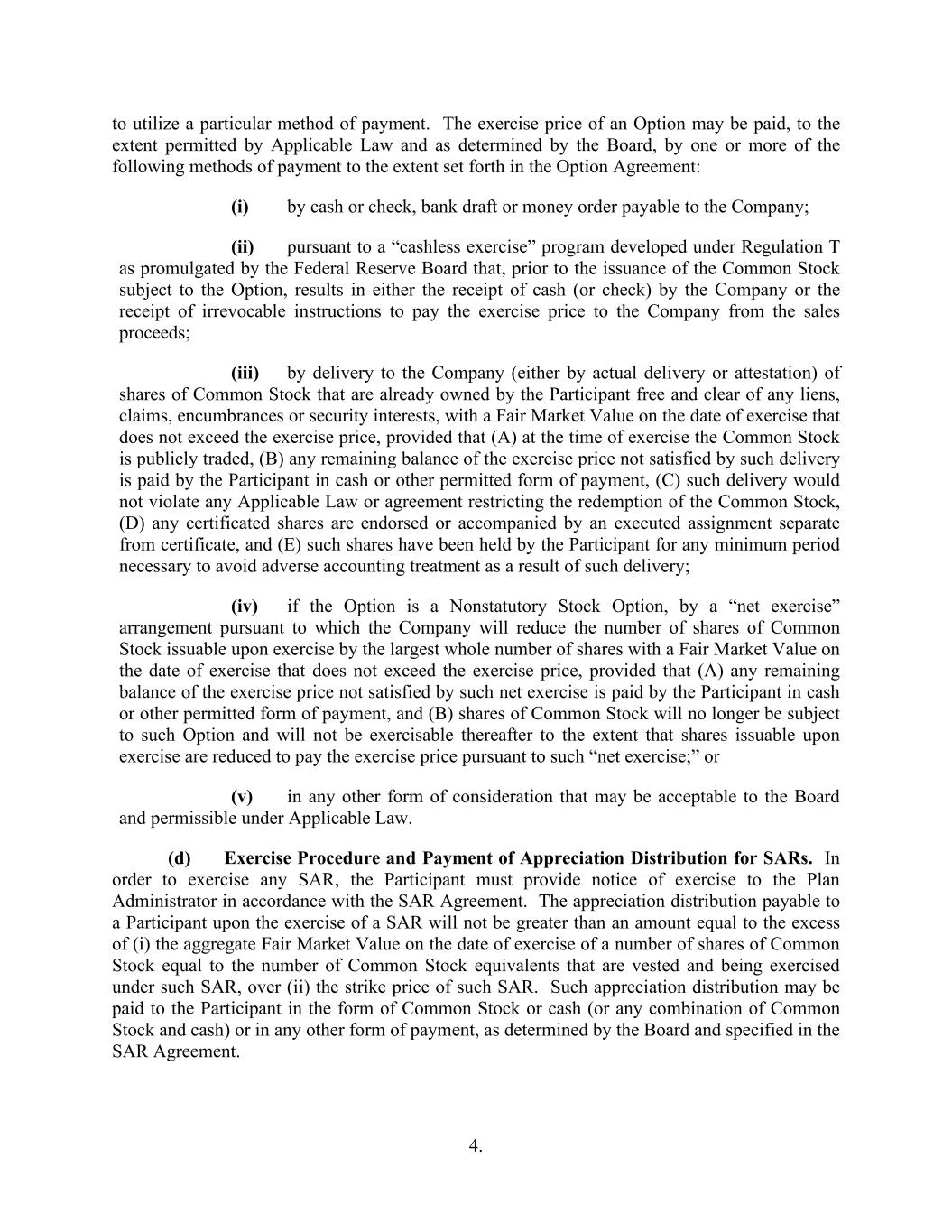 4. to utilize a particular method of payment. The exercise price of an Option may be paid, to the extent permitted by Applicable Law and as determined by the Board, by one or more of the following methods of payment to the extent set forth in the Option Agreement: (i) by cash or check, bank draft or money order payable to the Company; (ii) pursuant to a “cashless exercise” program developed under Regulation T as promulgated by the Federal Reserve Board that, prior to the issuance of the Common Stock subject to the Option, results in either the receipt of cash (or check) by the Company or the receipt of irrevocable instructions to pay the exercise price to the Company from the sales proceeds; (iii) by delivery to the Company (either by actual delivery or attestation) of shares of Common Stock that are already owned by the Participant free and clear of any liens, claims, encumbrances or security interests, with a Fair Market Value on the date of exercise that does not exceed the exercise price, provided that (A) at the time of exercise the Common Stock is publicly traded, (B) any remaining balance of the exercise price not satisfied by such delivery is paid by the Participant in cash or other permitted form of payment, (C) such delivery would not violate any Applicable Law or agreement restricting the redemption of the Common Stock, (D) any certificated shares are endorsed or accompanied by an executed assignment separate from certificate, and (E) such shares have been held by the Participant for any minimum period necessary to avoid adverse accounting treatment as a result of such delivery; (iv) if the Option is a Nonstatutory Stock Option, by a “net exercise” arrangement pursuant to which the Company will reduce the number of shares of Common Stock issuable upon exercise by the largest whole number of shares with a Fair Market Value on the date of exercise that does not exceed the exercise price, provided that (A) any remaining balance of the exercise price not satisfied by such net exercise is paid by the Participant in cash or other permitted form of payment, and (B) shares of Common Stock will no longer be subject to such Option and will not be exercisable thereafter to the extent that shares issuable upon exercise are reduced to pay the exercise price pursuant to such “net exercise;” or (v) in any other form of consideration that may be acceptable to the Board and permissible under Applicable Law. (d) Exercise Procedure and Payment of Appreciation Distribution for SARs. In order to exercise any SAR, the Participant must provide notice of exercise to the Plan Administrator in accordance with the SAR Agreement. The appreciation distribution payable to a Participant upon the exercise of a SAR will not be greater than an amount equal to the excess of (i) the aggregate Fair Market Value on the date of exercise of a number of shares of Common Stock equal to the number of Common Stock equivalents that are vested and being exercised under such SAR, over (ii) the strike price of such SAR. Such appreciation distribution may be paid to the Participant in the form of Common Stock or cash (or any combination of Common Stock and cash) or in any other form of payment, as determined by the Board and specified in the SAR Agreement.