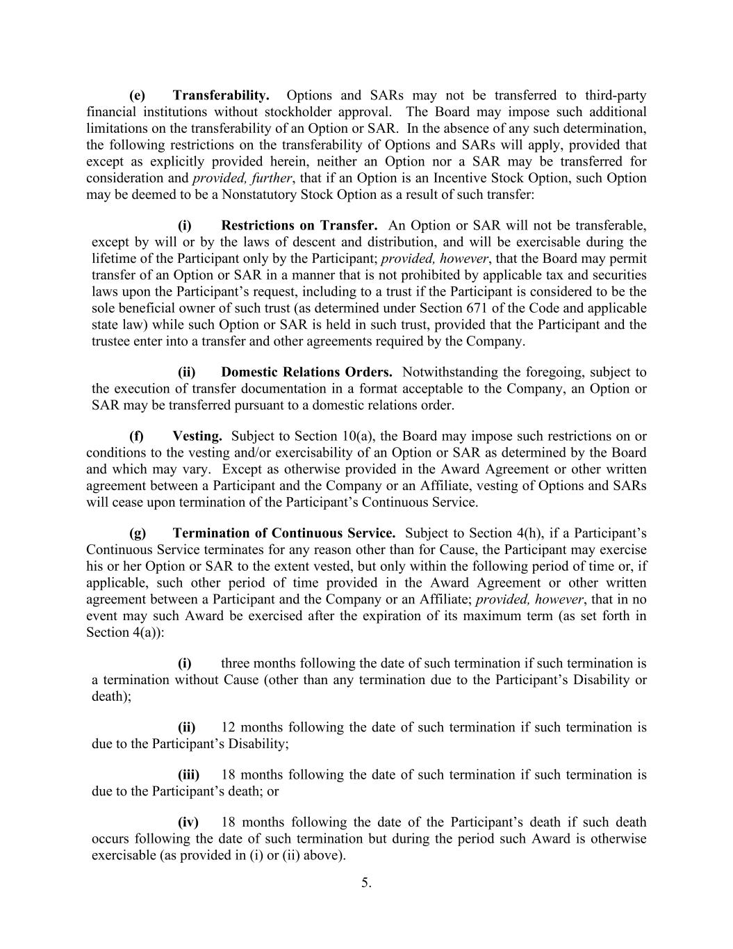 5. (e) Transferability. Options and SARs may not be transferred to third-party financial institutions without stockholder approval. The Board may impose such additional limitations on the transferability of an Option or SAR. In the absence of any such determination, the following restrictions on the transferability of Options and SARs will apply, provided that except as explicitly provided herein, neither an Option nor a SAR may be transferred for consideration and provided, further, that if an Option is an Incentive Stock Option, such Option may be deemed to be a Nonstatutory Stock Option as a result of such transfer: (i) Restrictions on Transfer. An Option or SAR will not be transferable, except by will or by the laws of descent and distribution, and will be exercisable during the lifetime of the Participant only by the Participant; provided, however, that the Board may permit transfer of an Option or SAR in a manner that is not prohibited by applicable tax and securities laws upon the Participant’s request, including to a trust if the Participant is considered to be the sole beneficial owner of such trust (as determined under Section 671 of the Code and applicable state law) while such Option or SAR is held in such trust, provided that the Participant and the trustee enter into a transfer and other agreements required by the Company. (ii) Domestic Relations Orders. Notwithstanding the foregoing, subject to the execution of transfer documentation in a format acceptable to the Company, an Option or SAR may be transferred pursuant to a domestic relations order. (f) Vesting. Subject to Section 10(a), the Board may impose such restrictions on or conditions to the vesting and/or exercisability of an Option or SAR as determined by the Board and which may vary. Except as otherwise provided in the Award Agreement or other written agreement between a Participant and the Company or an Affiliate, vesting of Options and SARs will cease upon termination of the Participant’s Continuous Service. (g) Termination of Continuous Service. Subject to Section 4(h), if a Participant’s Continuous Service terminates for any reason other than for Cause, the Participant may exercise his or her Option or SAR to the extent vested, but only within the following period of time or, if applicable, such other period of time provided in the Award Agreement or other written agreement between a Participant and the Company or an Affiliate; provided, however, that in no event may such Award be exercised after the expiration of its maximum term (as set forth in Section 4(a)): (i) three months following the date of such termination if such termination is a termination without Cause (other than any termination due to the Participant’s Disability or death); (ii) 12 months following the date of such termination if such termination is due to the Participant’s Disability; (iii) 18 months following the date of such termination if such termination is due to the Participant’s death; or (iv) 18 months following the date of the Participant’s death if such death occurs following the date of such termination but during the period such Award is otherwise exercisable (as provided in (i) or (ii) above).